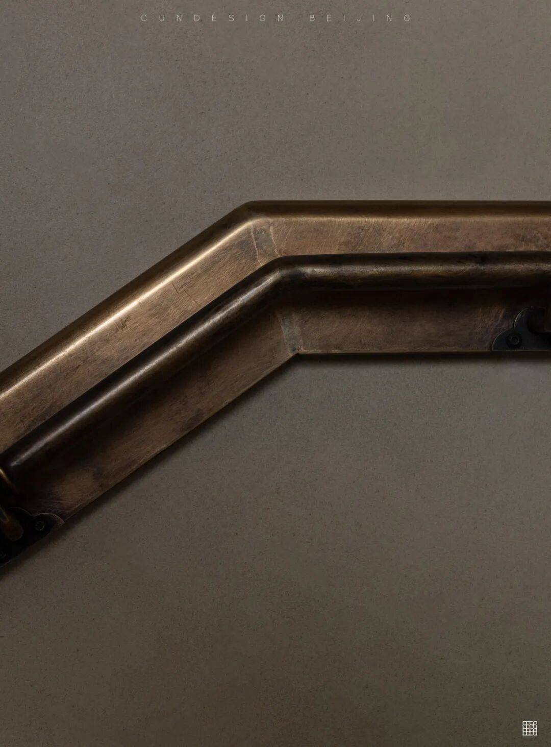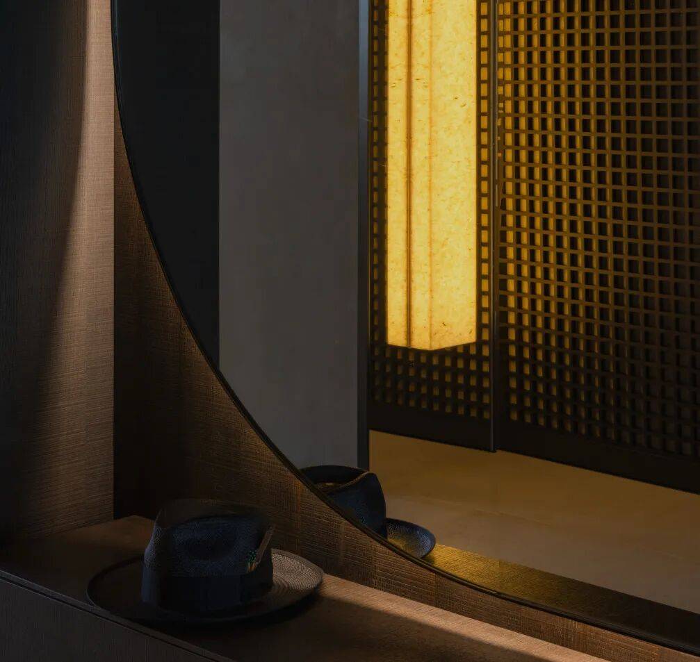 古铜的质感和比例,将人从玄关引入客厅,侧壁预留了内嵌的展龛,让灯光在墙面投下,将这面墙变的有流动感。