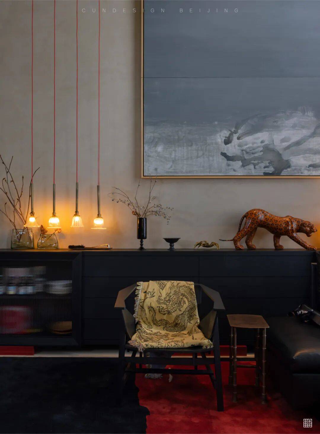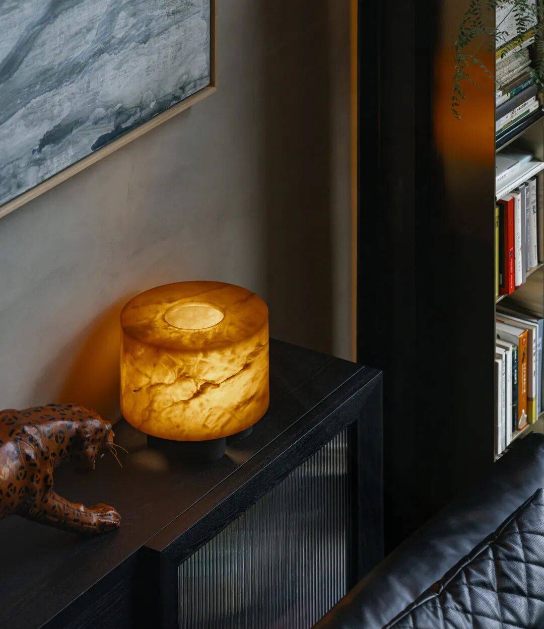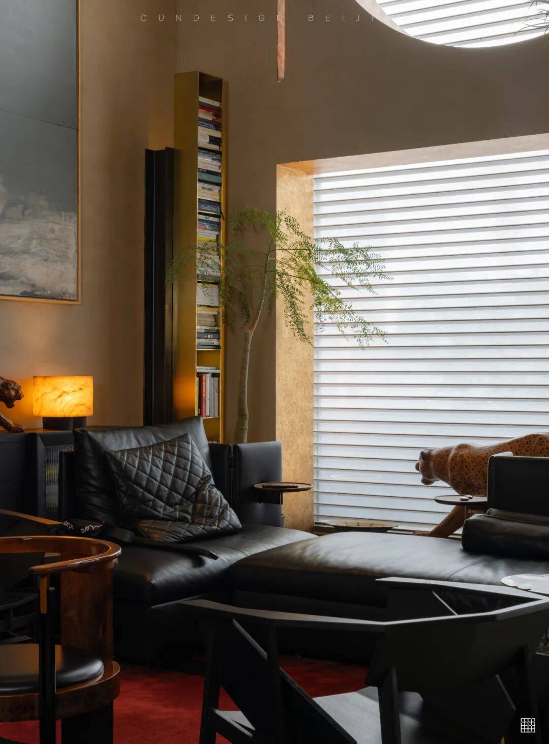 功能与美学的平衡:楼梯铜制扶手隐藏了电视机(深色背板“隐入”空间),既满足实用需求,又保持视觉整洁;法国艺术家的中古豹子雕塑、陈林的太湖石画作等艺术品,成为空间的“情感符号”,而非装饰;
