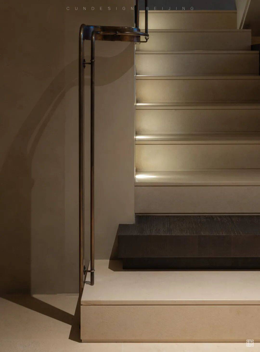 材质互动:古铜扶手与米白石材踏步形成质感对话,侧壁展龛灯光随人体移动变化,增强沉浸感。