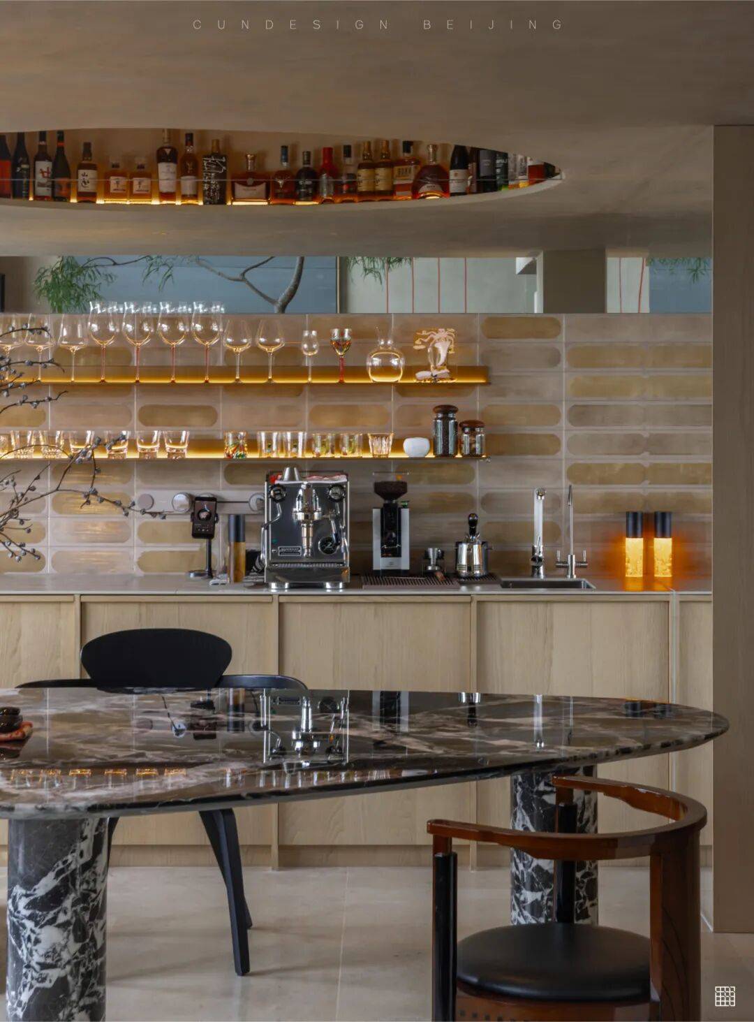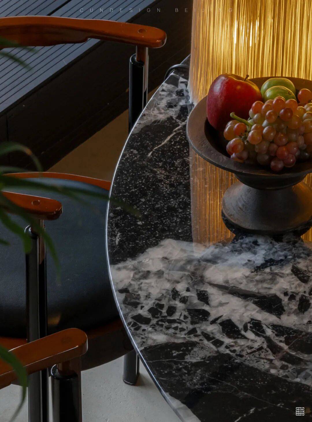 材料的“时间感”:铜制楼梯扶手(竹节灵感)、铜制饰面岛台等金属材质,会随着时间氧化产生质感变化,呼应“长期居住”的主题;大理石餐桌、黑色边柜等材质则强调耐用性与实用性。