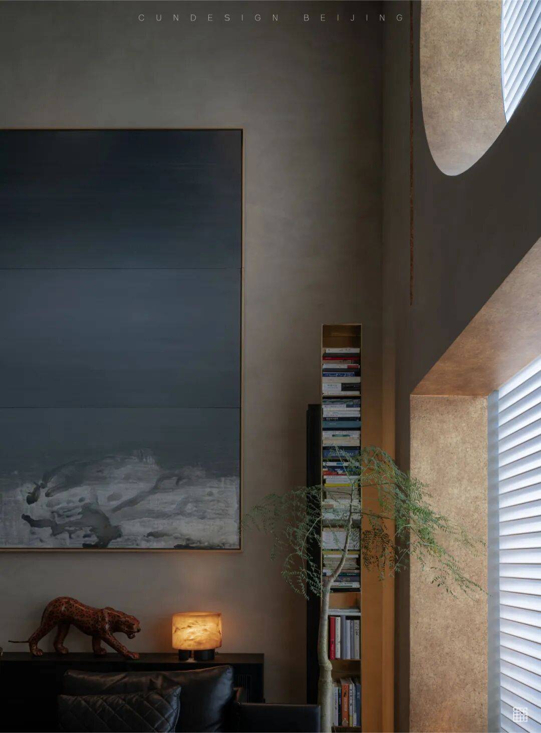自然与光影的运用:南向窗户采用无窗帘的百叶横格栅,过滤后的阳光形成韵律感,既保证采光又不刺眼;客厅的一方一圆窗引入大量自然光,与室内的植物(如昆士兰瓶)、画作(陈林的太湖石主题)形成“自然-空间”的对话;