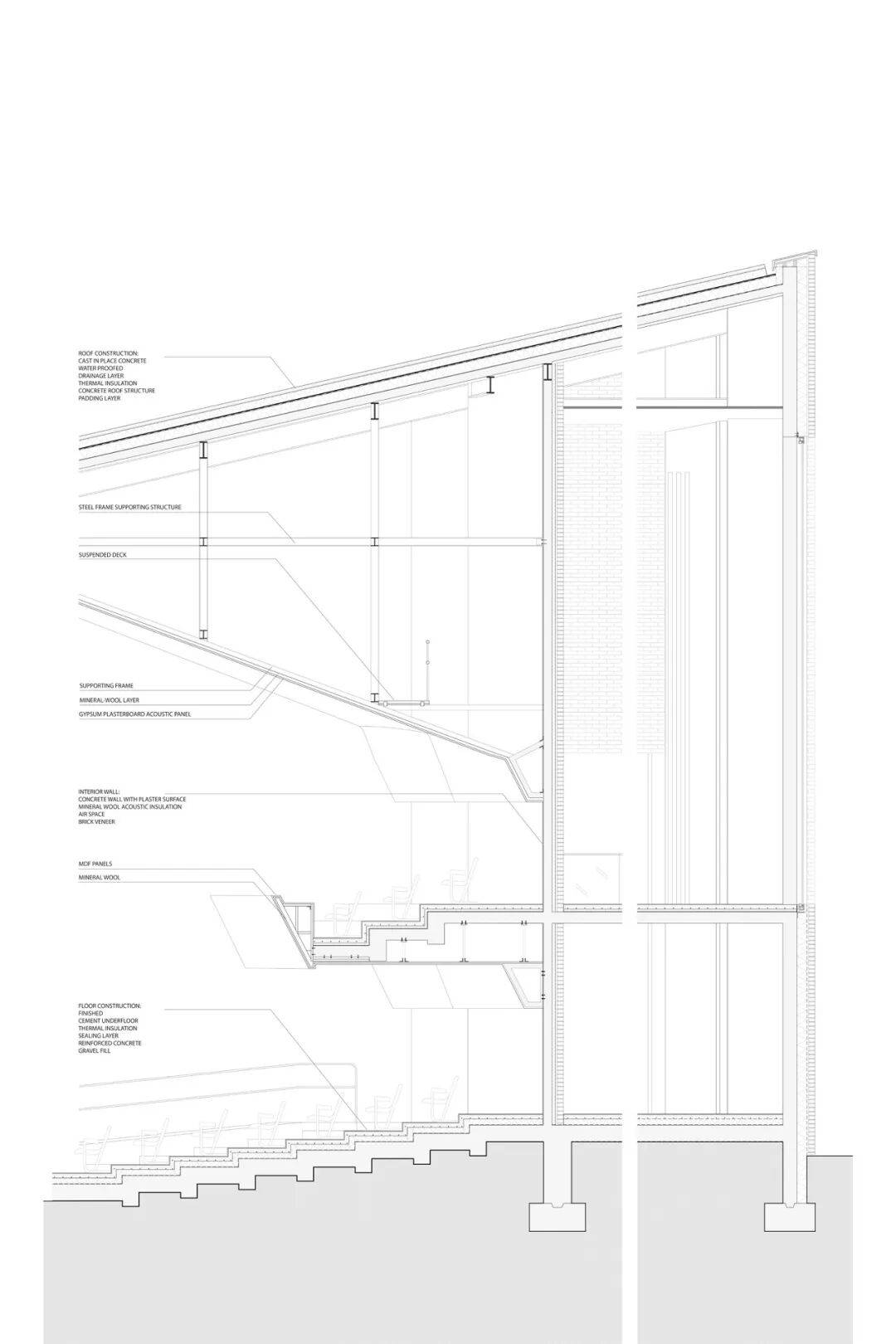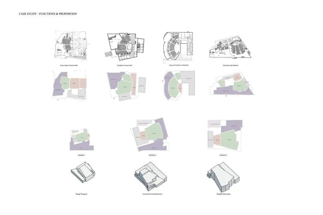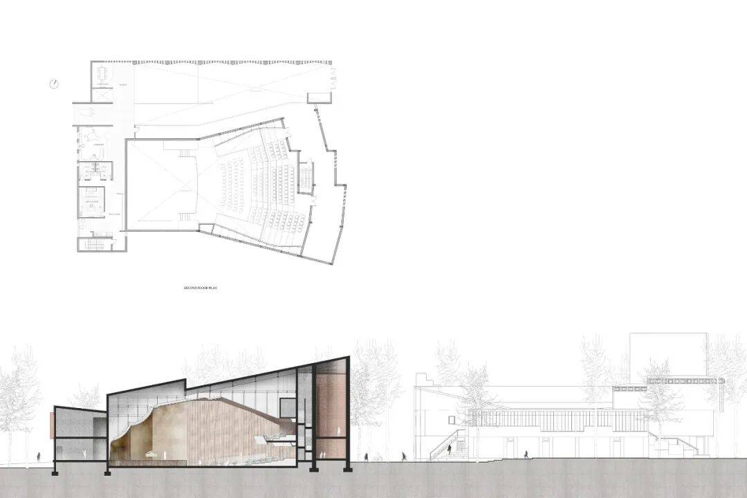空间分区:设置两条独立动线,一条面向访客(入口大厅、礼品店、观众廊、音乐厅),另一条面向演奏人员(排练室、后台、储藏空间)。