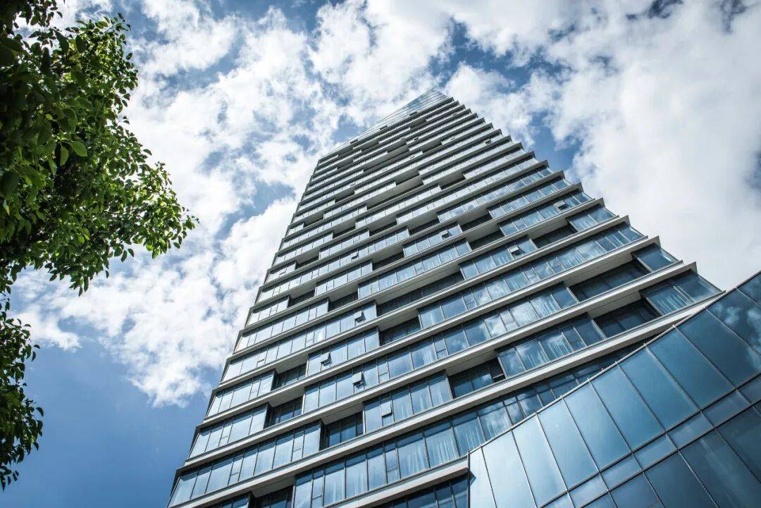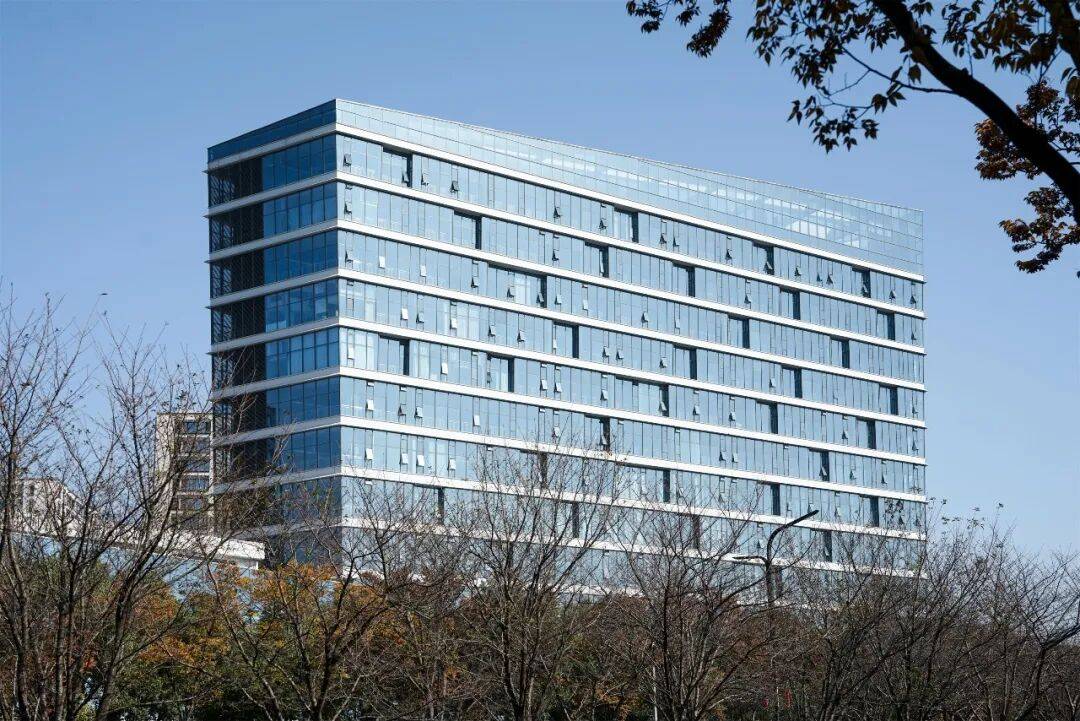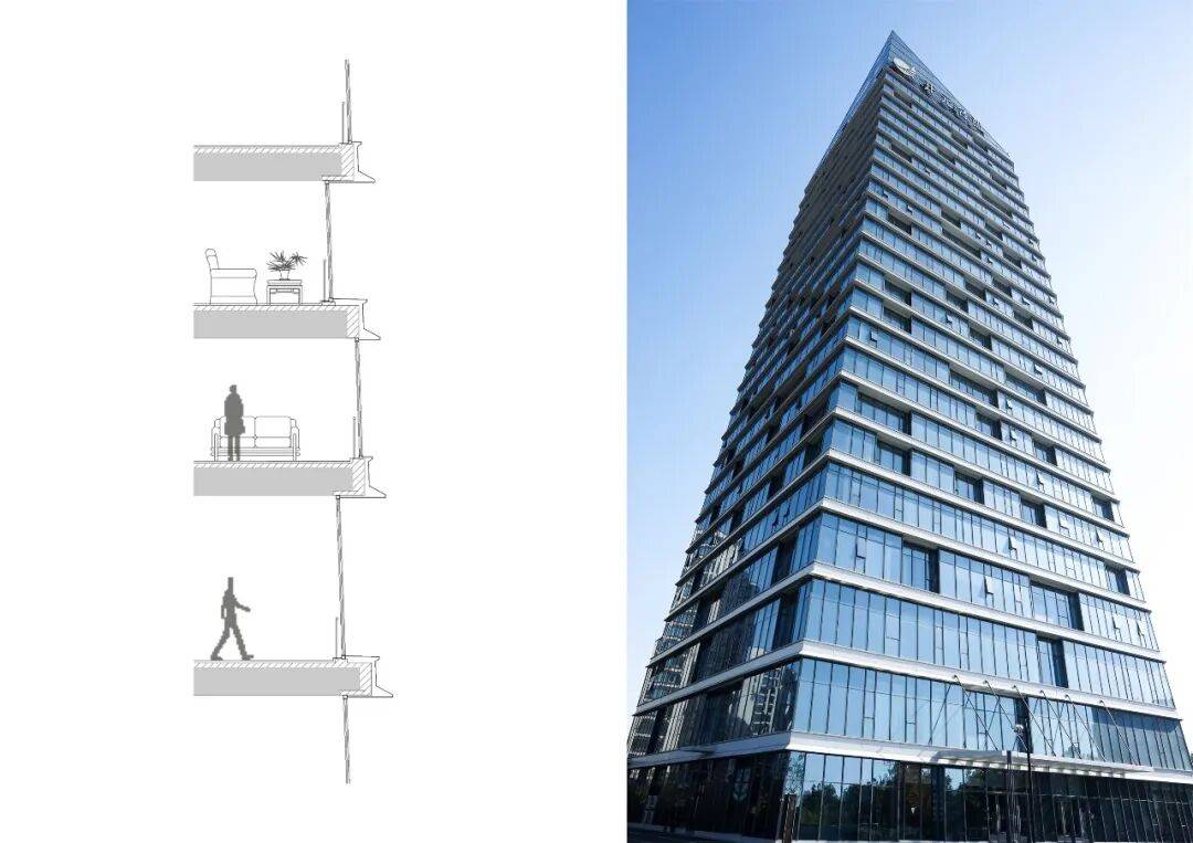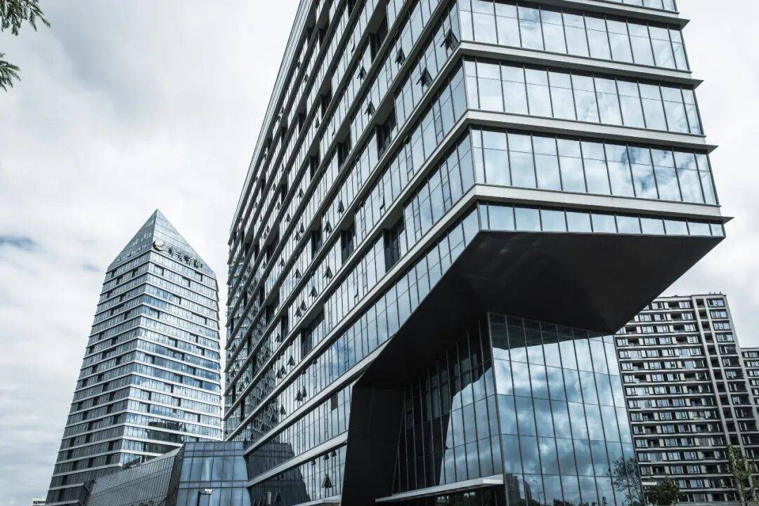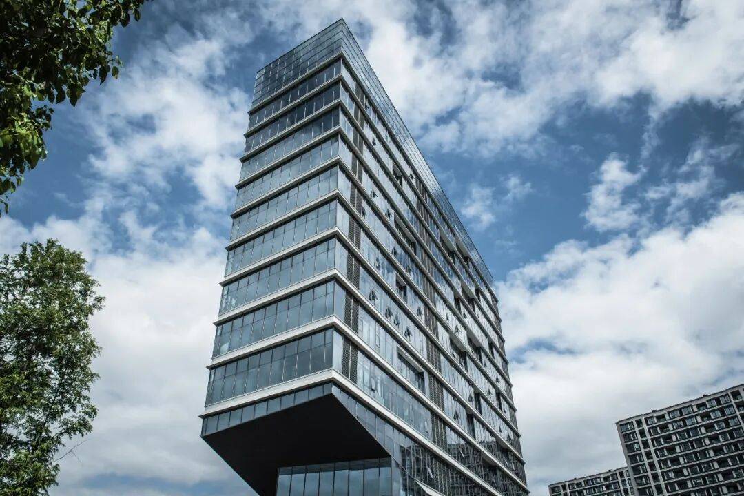 立面语言:以“江水”为灵感,采用凹凸排列的横向窗洞模拟江波形态,楼层间设置浅白灰色哑光铝合金单板,与玻璃幕墙形成材质对比。