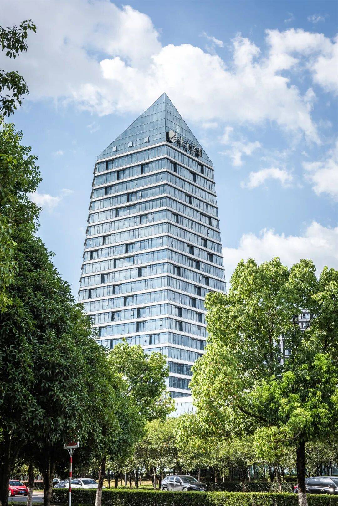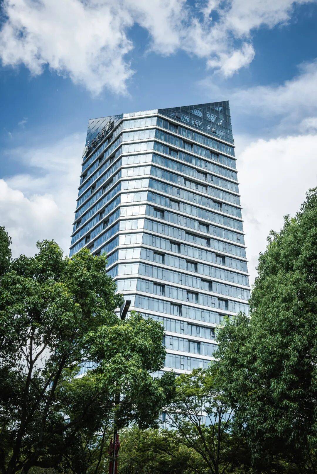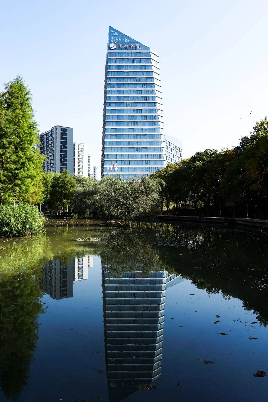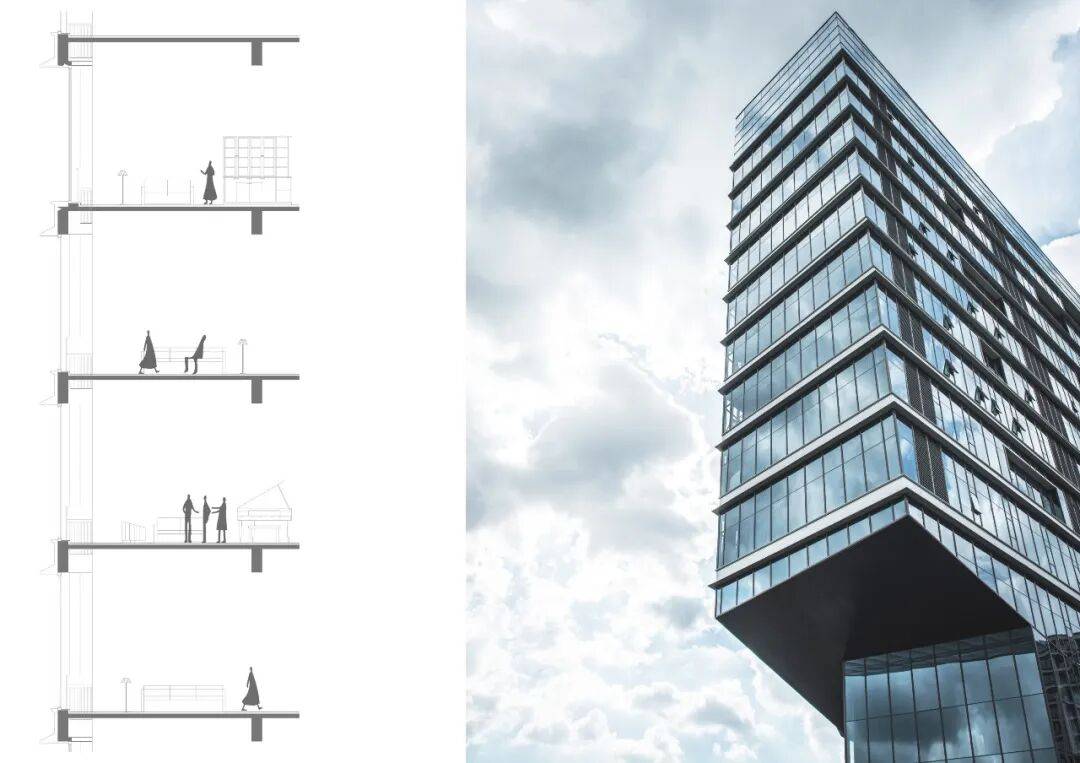 立面语言:以“江水”为灵感,采用凹凸排列的横向窗洞模拟江波形态,楼层间设置浅白灰色哑光铝合金单板,与玻璃幕墙形成材质对比。