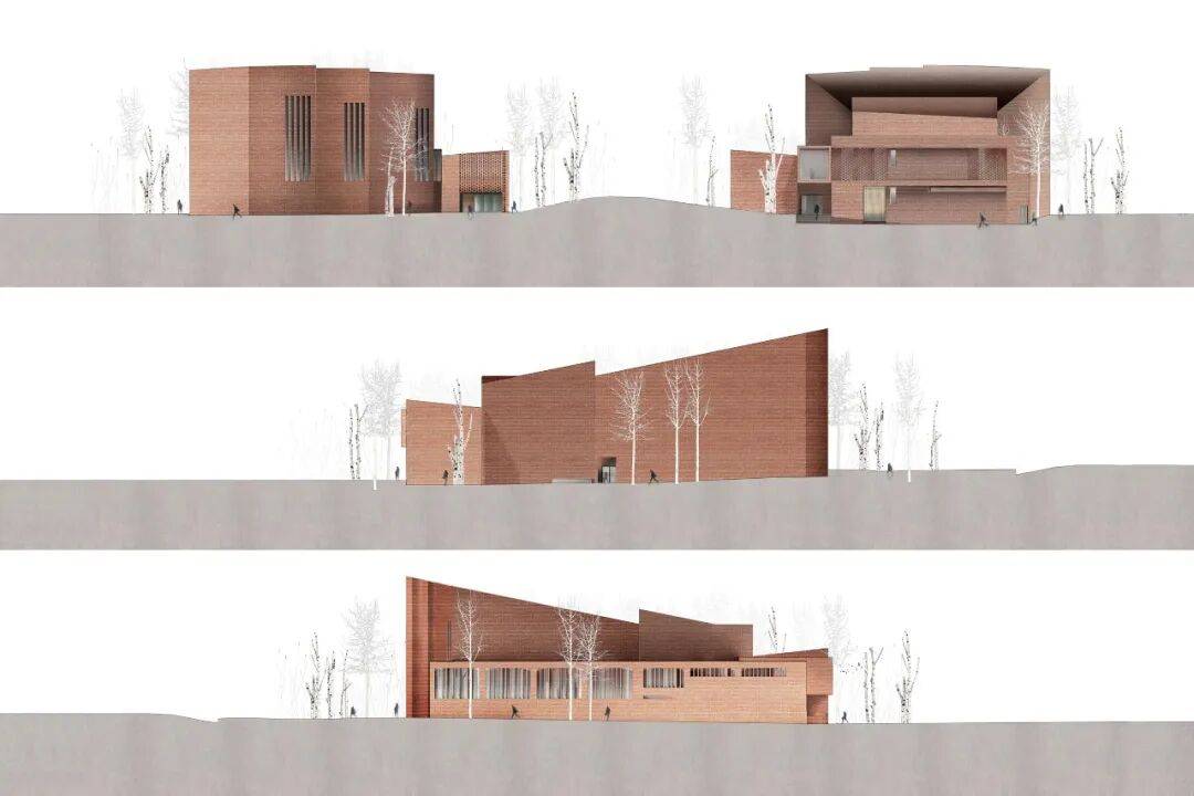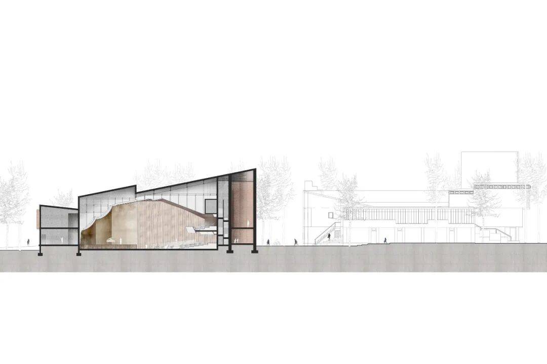材料运用:以木材与红砖为主,入口立面结合穿孔砖墙与玻璃幕墙,室内采用弧形木质面板,营造宁静、克制的森林意象氛围。