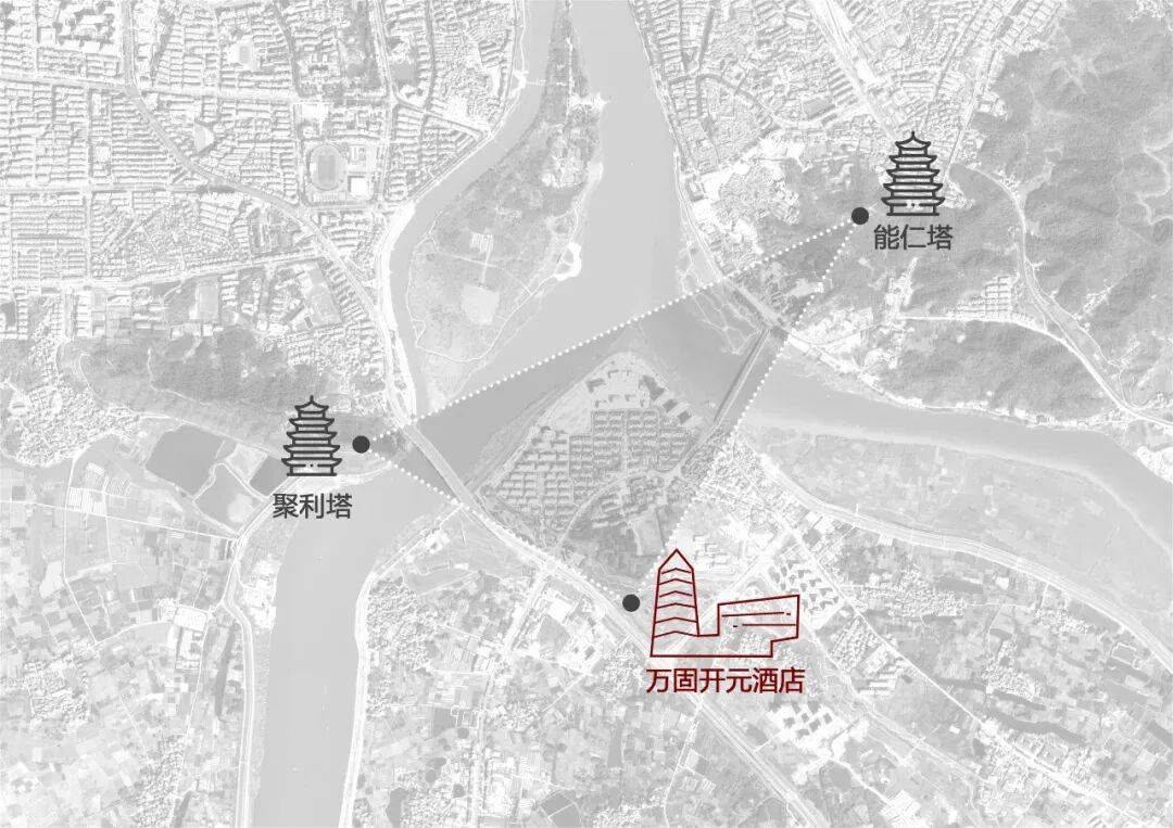 兰溪古城历史上的能仁塔、同仁塔,兼具航标、风水象征与精神图腾的属性,是城市独特的天际线记忆。如今 “兰溪塔” 的筑成,并非简单复刻,而是以竖向形态呼应古塔的精神内核,唤醒古城记忆。在规划设计中,将新塔与两座古塔置于同一视觉轴线,形成 “三足鼎立” 的空间格局。