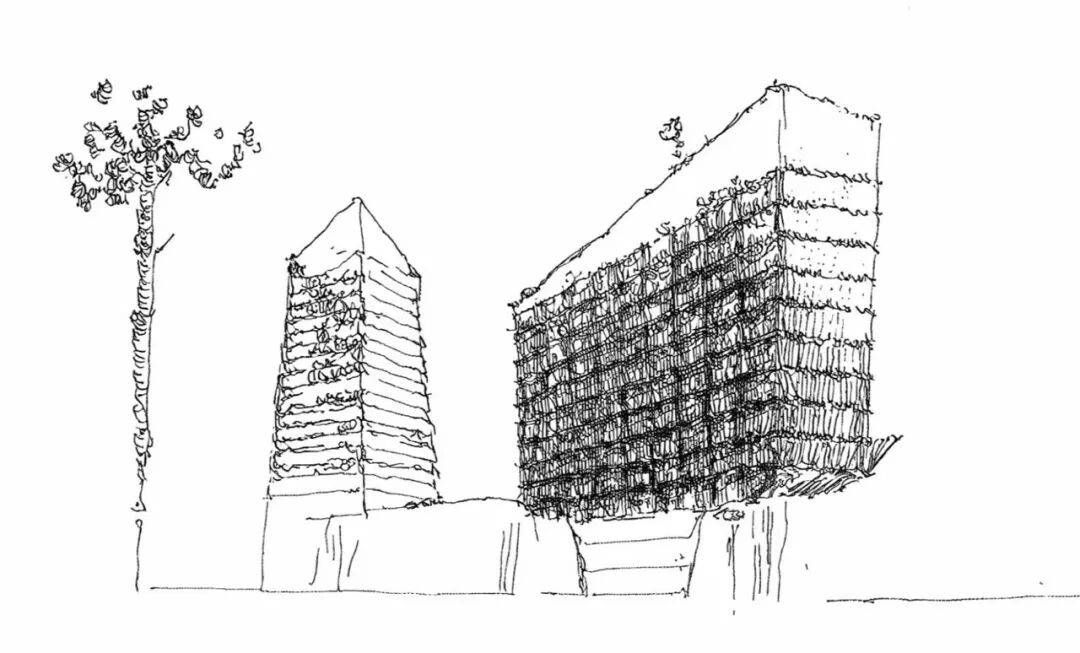 设计草图:以三江汇流点为视觉中心,采用极简竖向线条呼应古塔,底部裙房横向展开,预留景观通廊,实现历史与现代、城市与自然的衔接。