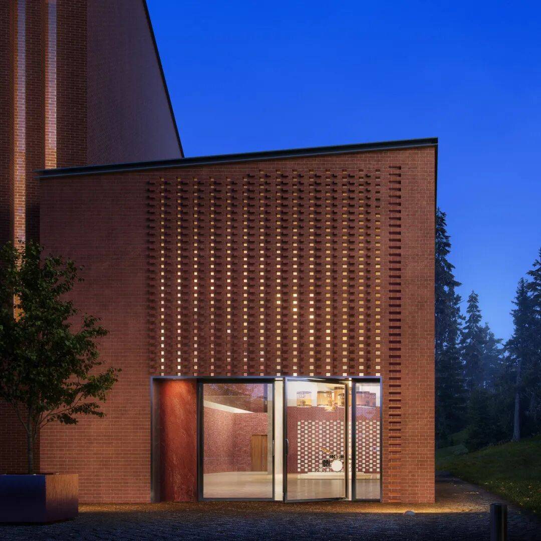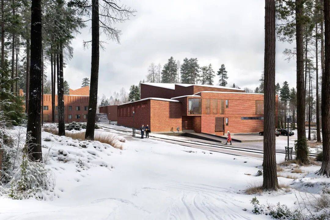 项目创新性地运用木材与红砖等天然材料,既体现芬兰地域文化,又强调可持续性。这些材料被整合于立面与入口大厅之中,营造出与自然互动、并最大化环境效益的空间体验。音乐厅内部采用全木质设计,弯曲的木质天花在优化声学效果的同时,营造出宁静、克制而富有森林意象的氛围。