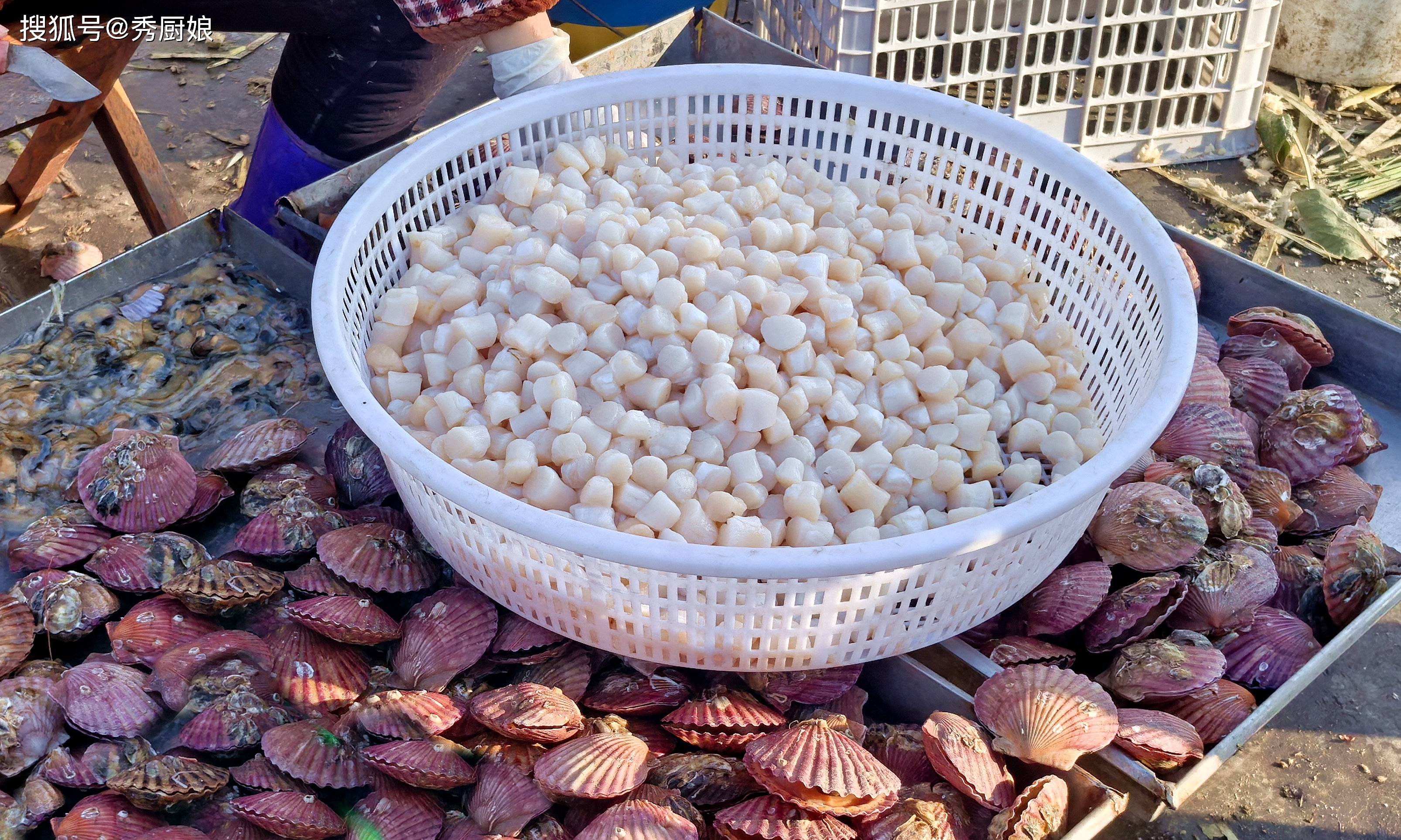 冬天的扇贝肉特别饱满,那个白色的贝柱(干贝就是它晒干的)又Q弹又鲜甜,围着的一圈橘红色的是它的生殖腺,冬天特别肥美。扇贝味道温和,鲜甜味足,怎么做都好吃。