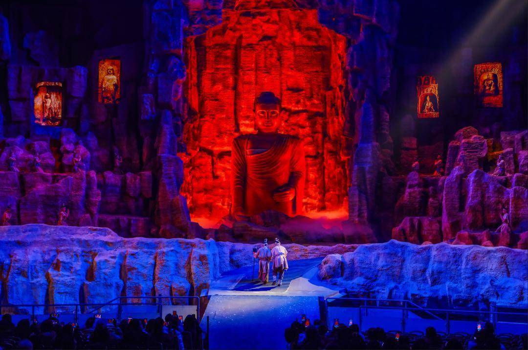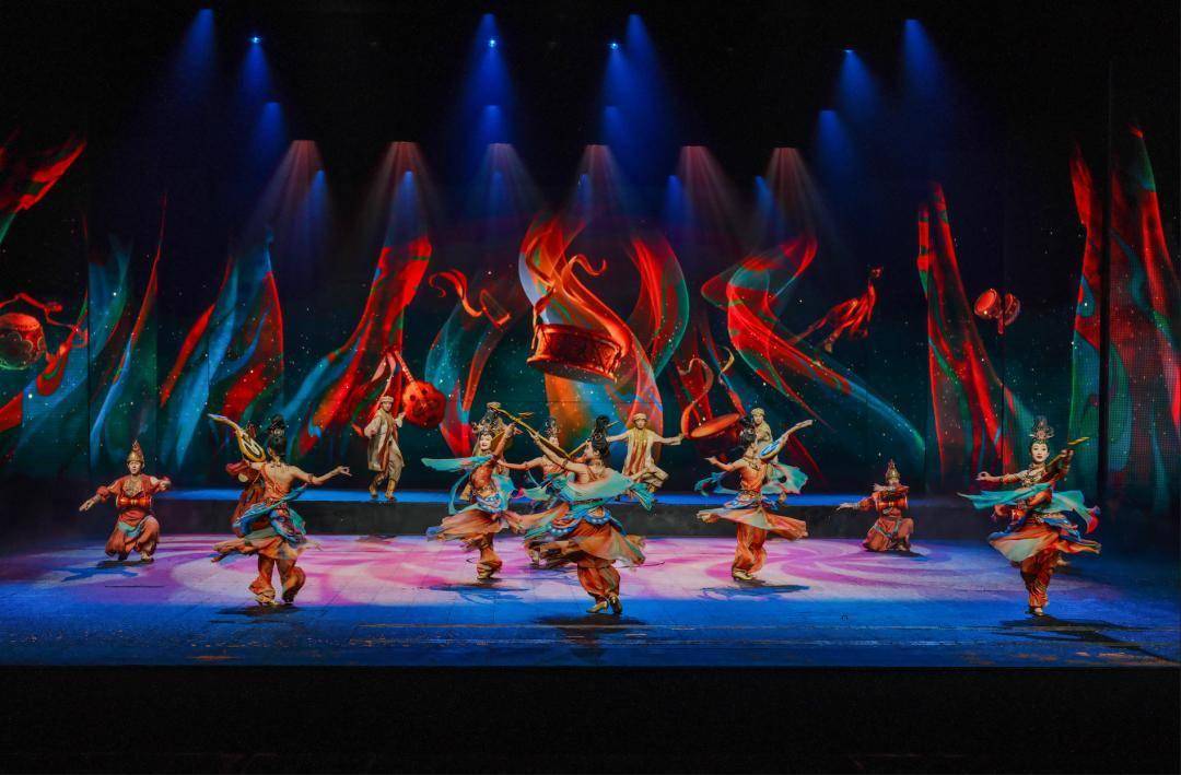 演员服饰严格参照唐代壁画与出土文物复原,贵妃的蹙金绣罗裙、宫女的齐胸襦裙,在灯光下流光溢彩;