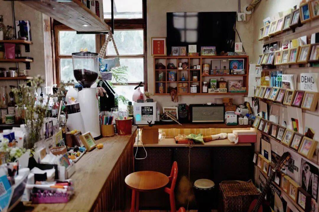 我最喜欢三楼,是咖啡+酒结合的小空间,还有设计摄影作品展示,墙上贴满了各种可爱的小画,细节做得很用心。