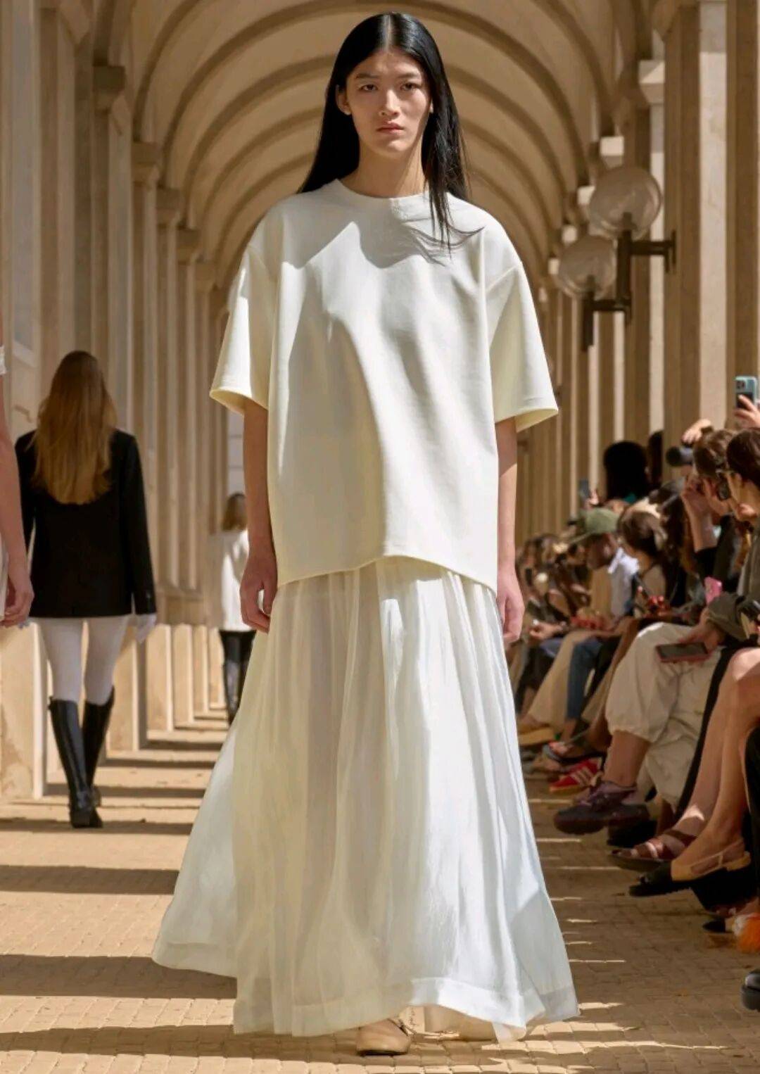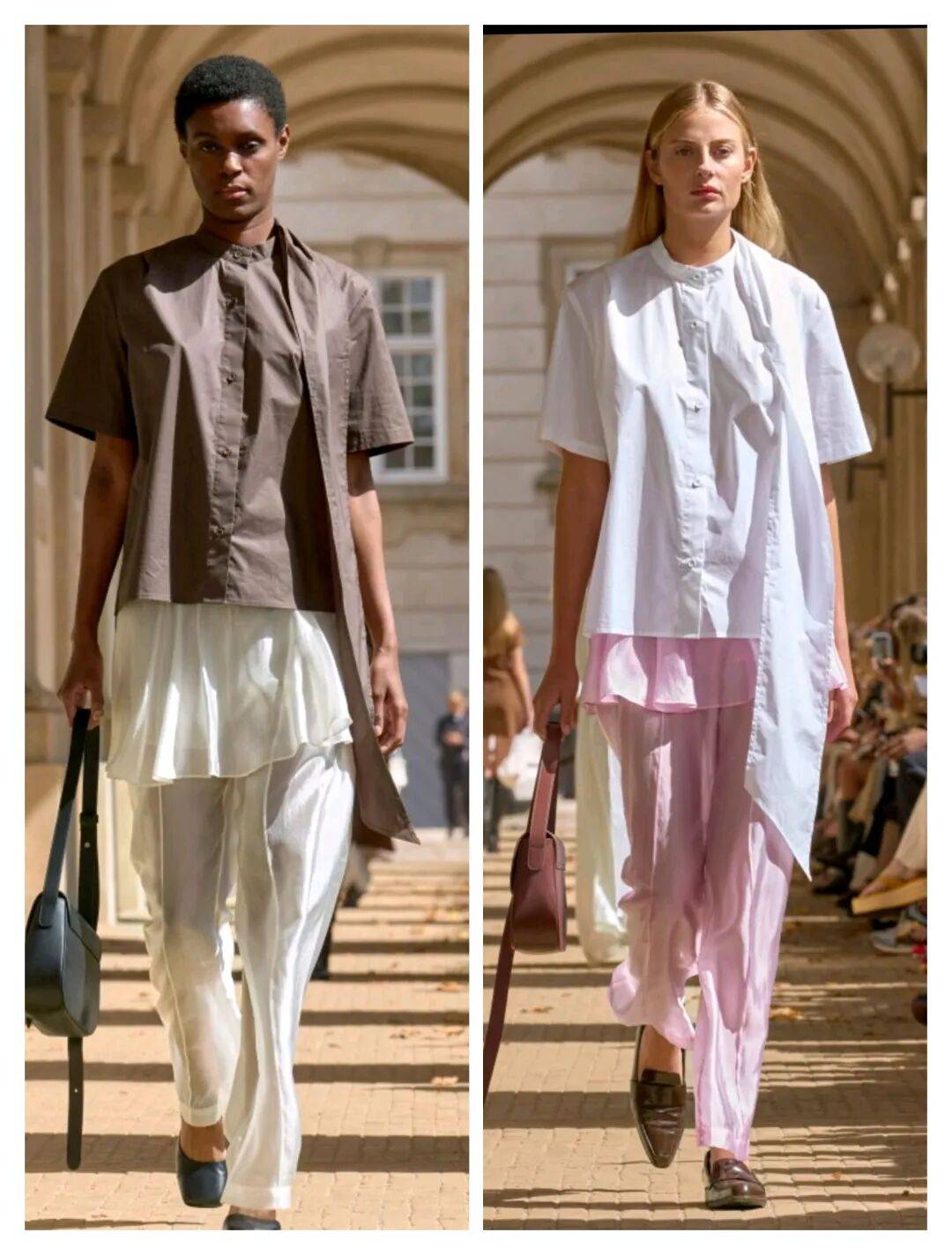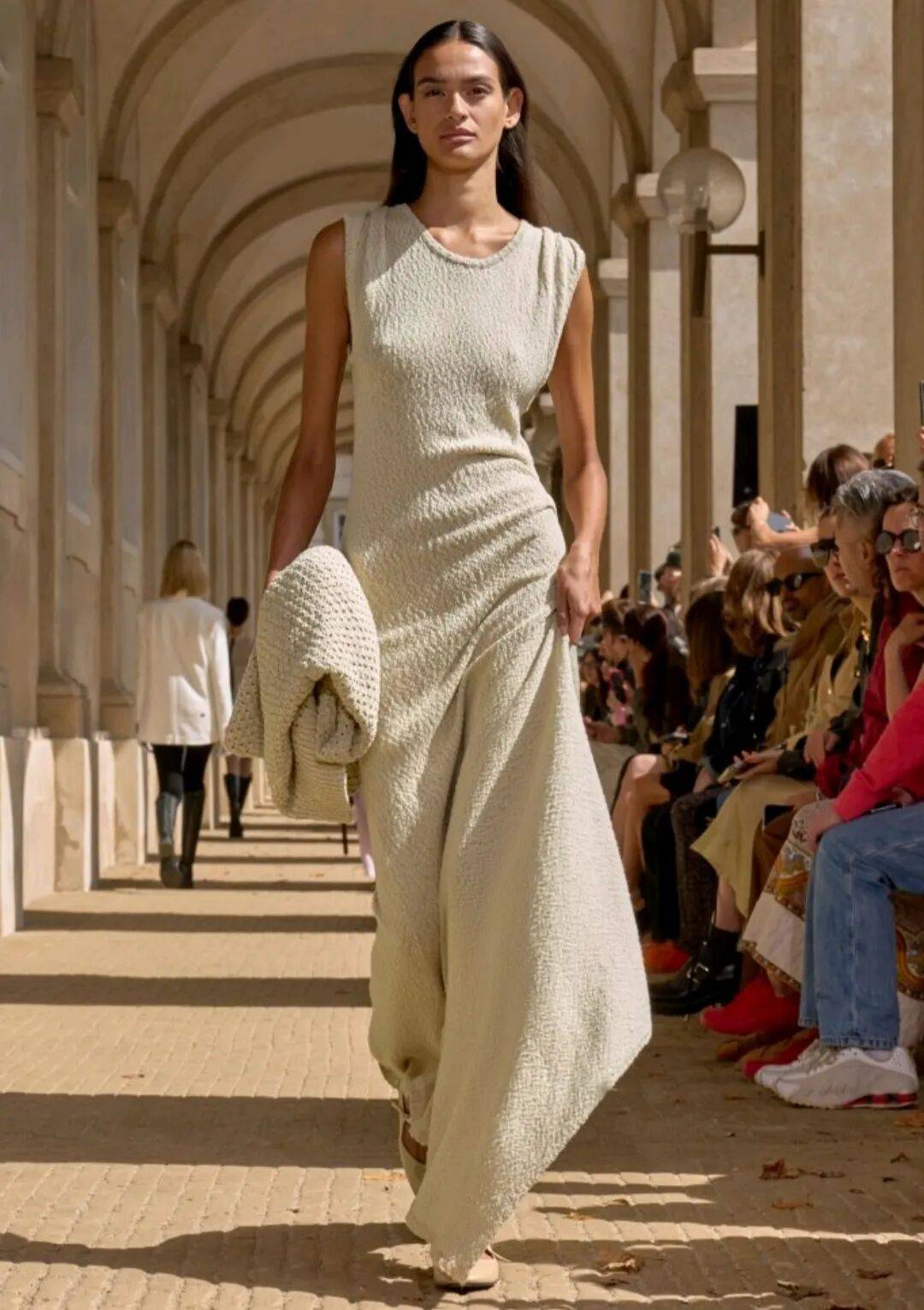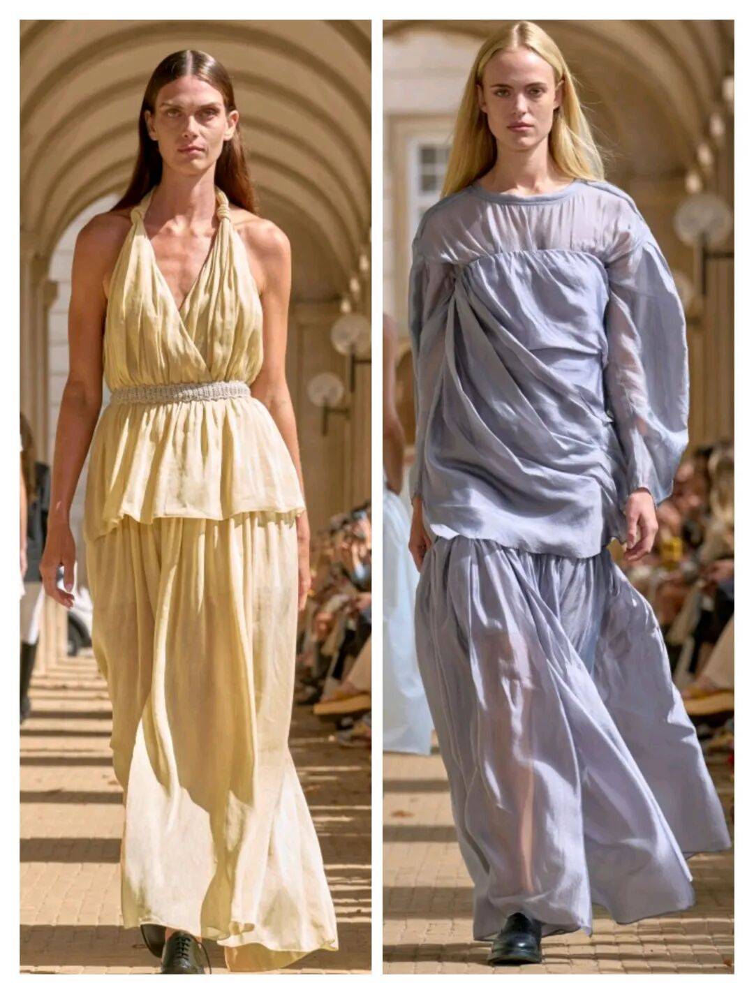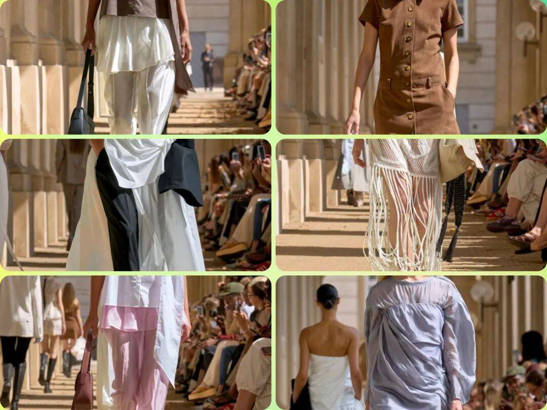 流动感:宽松亚麻套装、解构式无尾礼服、垂坠感连衣裙,强调"从马场到画廊"的无缝转换