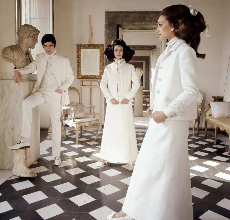1968年,“全白系列”以纯净极致的优雅轰动欧洲,《Vogue》毫不吝惜赞美,而那标志性的 “V”字母也首次镌刻于设计之中,成为优雅的隐形签名。
