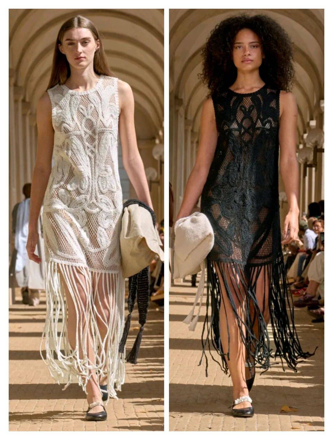 无袖的服装在连衣裙的优雅中,温婉也时髦,还在镂空蕾丝的材质中增加了一些小性感的纹理,裙摆的位置以流苏的设计也增加动感的细节。