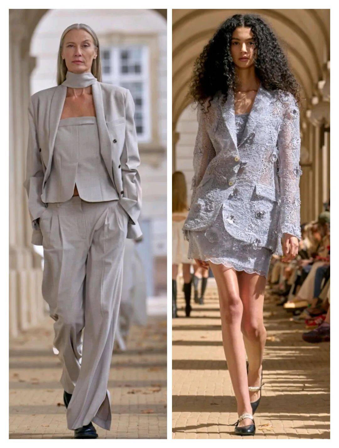 灰色系颜色的低调中以套装的穿搭多一些低调的柔和气质,在西服的元素中增加了几分强势干练的气质,结合了轻薄纹理、立体元素、开叉裤脚等设计的出现,让灰色的服装也有不少细节的设计感。