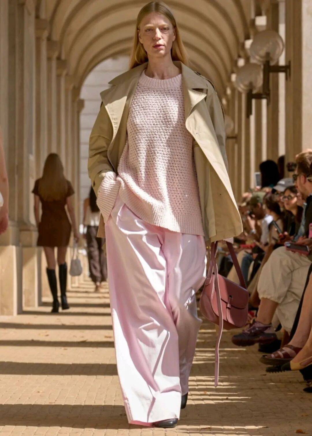 浅粉色颜色的服装以纹理内搭、直筒裤等服装的搭配,在粉嫩娇柔的少女感中,还有质感差异也更多了简约利落感,以卡其色外套的搭配,还让穿搭多了一些层次感。