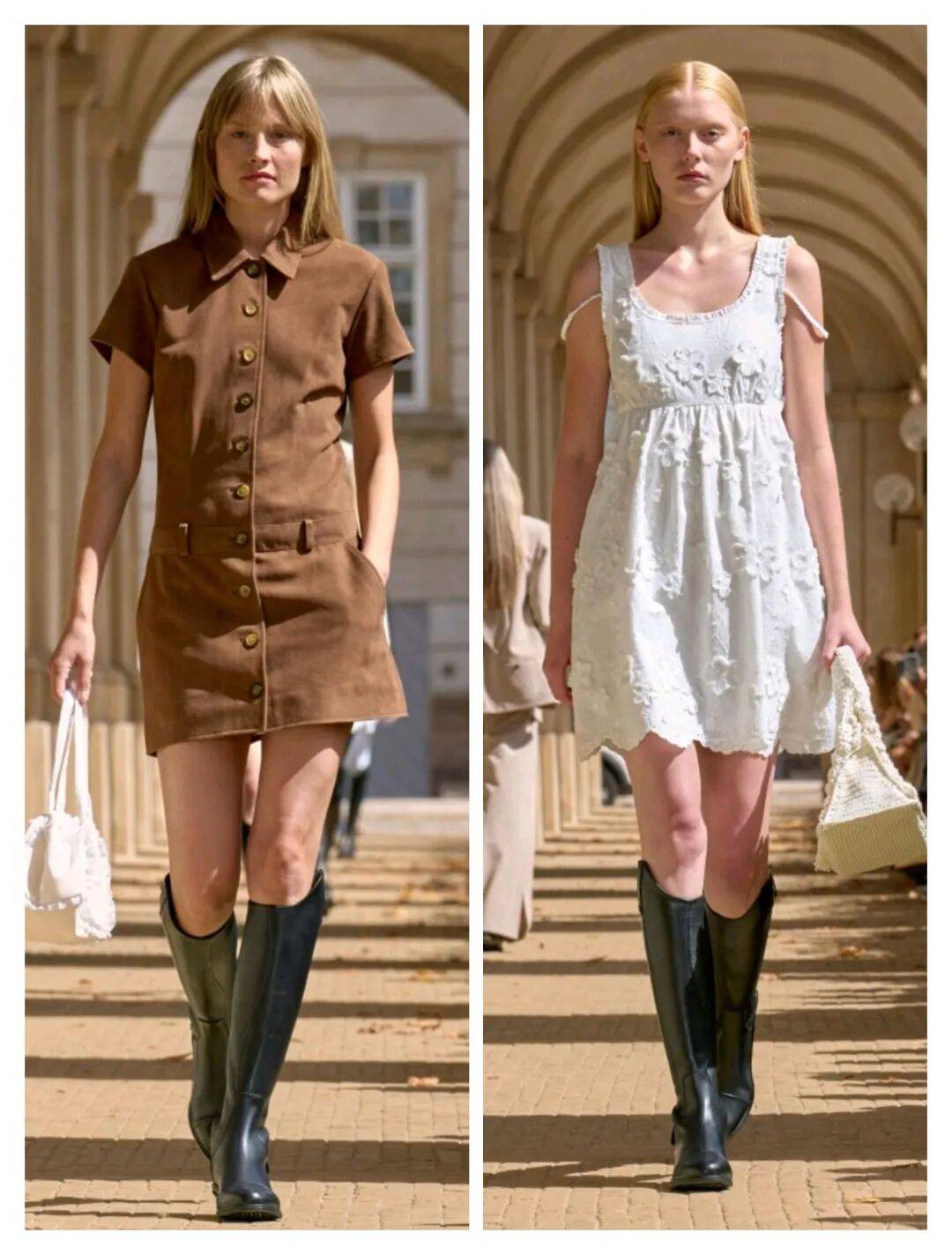 短款的裙装在棕色、白色等颜色的低调大方中,优雅裙装还结合了低腰、高腰、立体元素、纽扣等这些设计的装饰,为纯色的裙装增加更多细节的设计感,而和黑色靴子的搭配,也更为时髦。