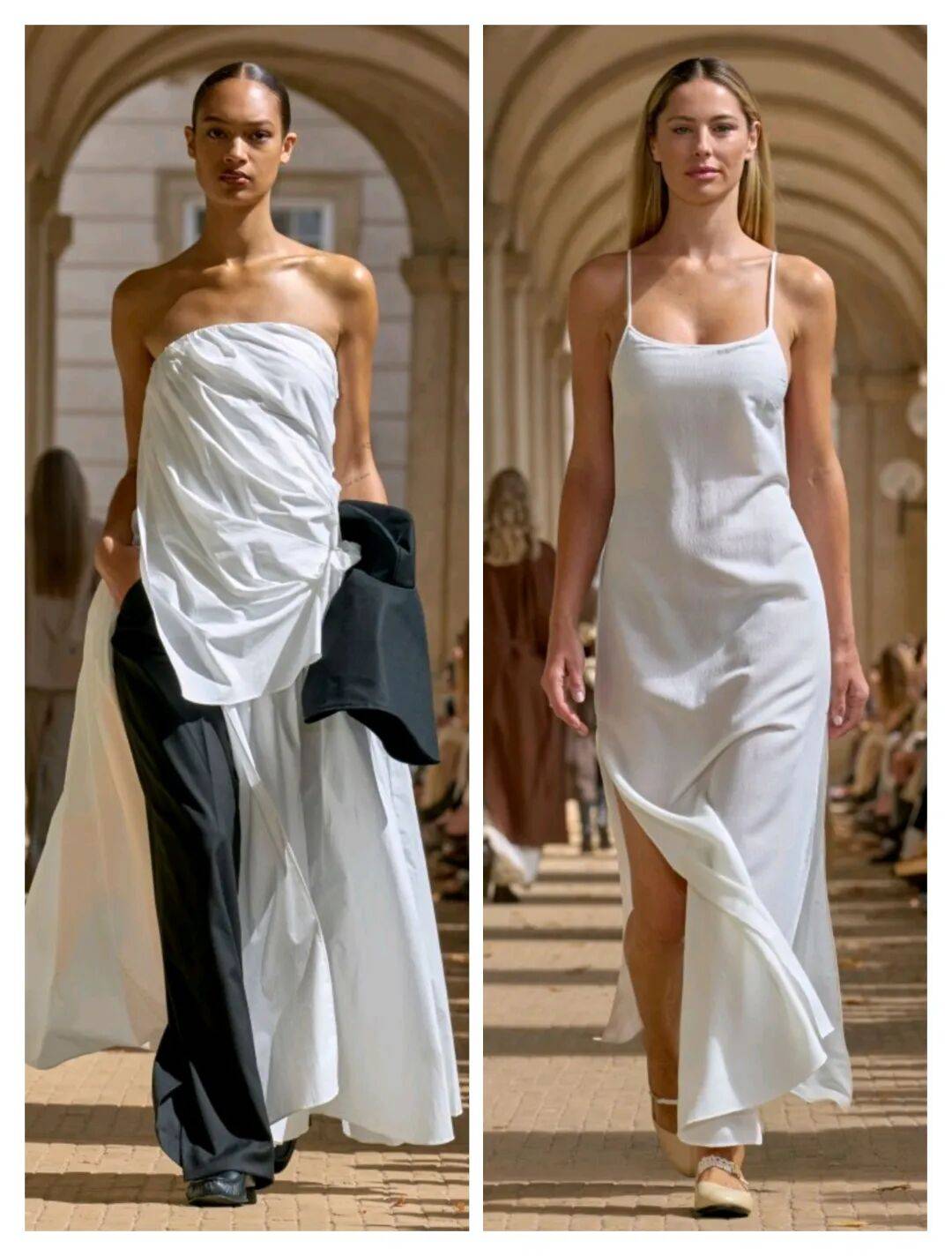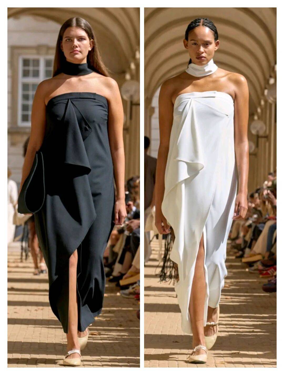 纯黑色、纯白色这些经典颜色的中性大方的颜色,在抹胸的款式中露出了肩颈线条,还在裙摆的开叉中也结合了造型感,为纯色的裙装增加更多细节的时尚感。