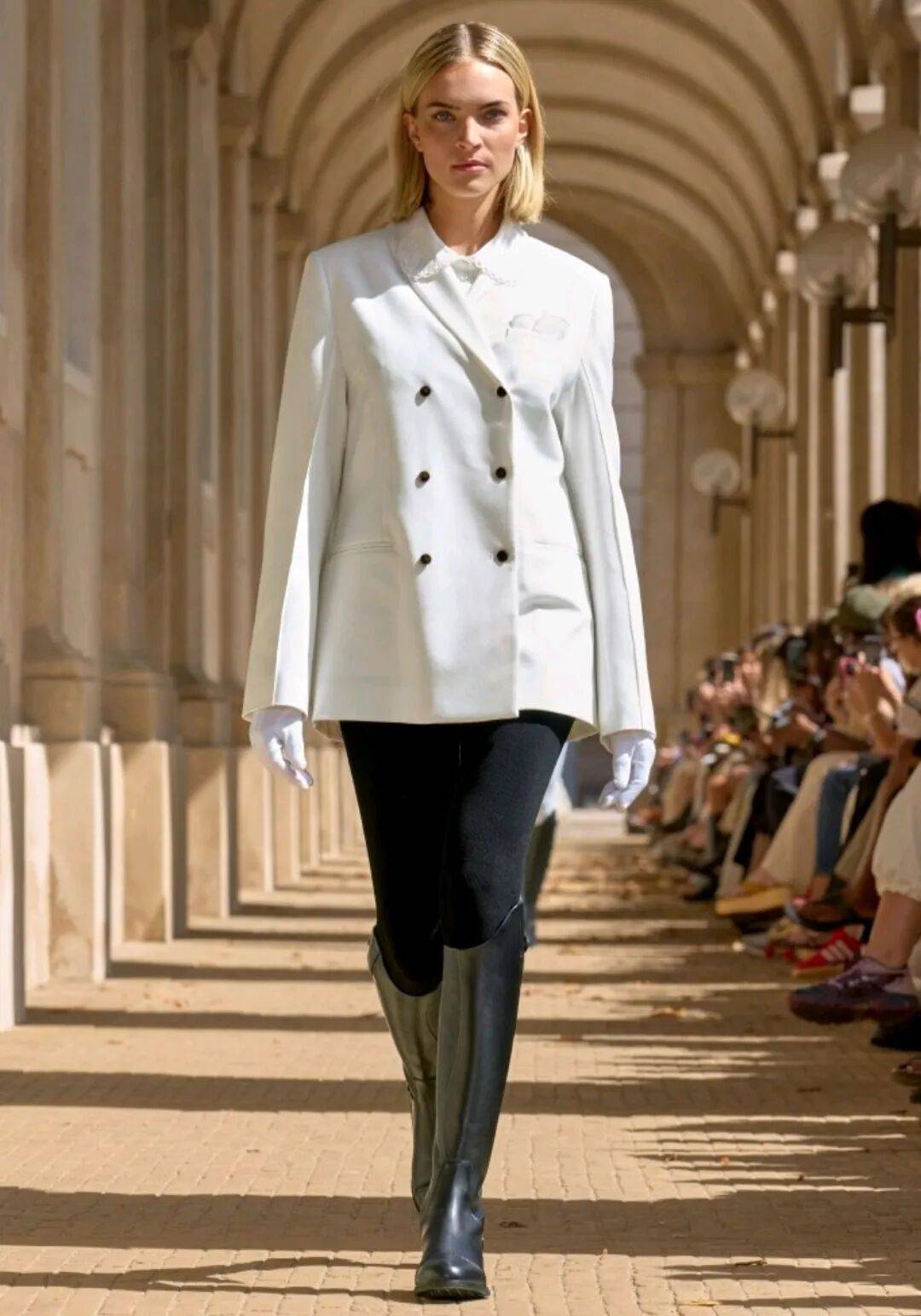 白色西服上衣和黑色紧身裤的搭配,多了色彩的对比差异,在混搭中,干练的西服在靴子的搭配中多了一些酷飒的时髦。