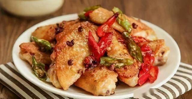 2锅内入油烧至7分钟,倒入花椒、青红椒段爆香。倒入鸡翅,转中小火慢煎。