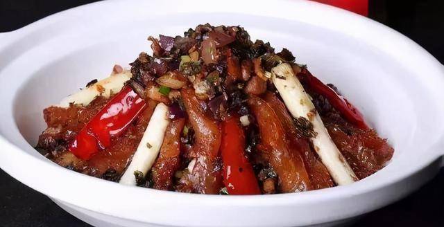 2、早一天晚上,把干竹笋放在沸水中浸泡。第二天,他们在沸水中浸泡,直到干竹笋膨胀和软化。用手把它们撕开。