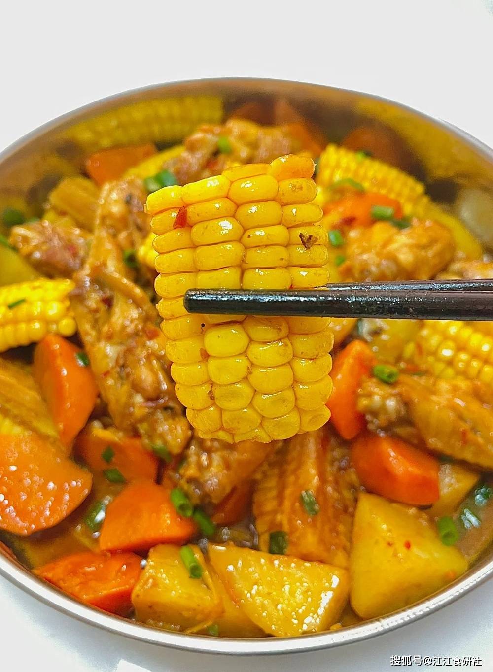 胡萝卜和玉米裹着浓汁,甜津津的。