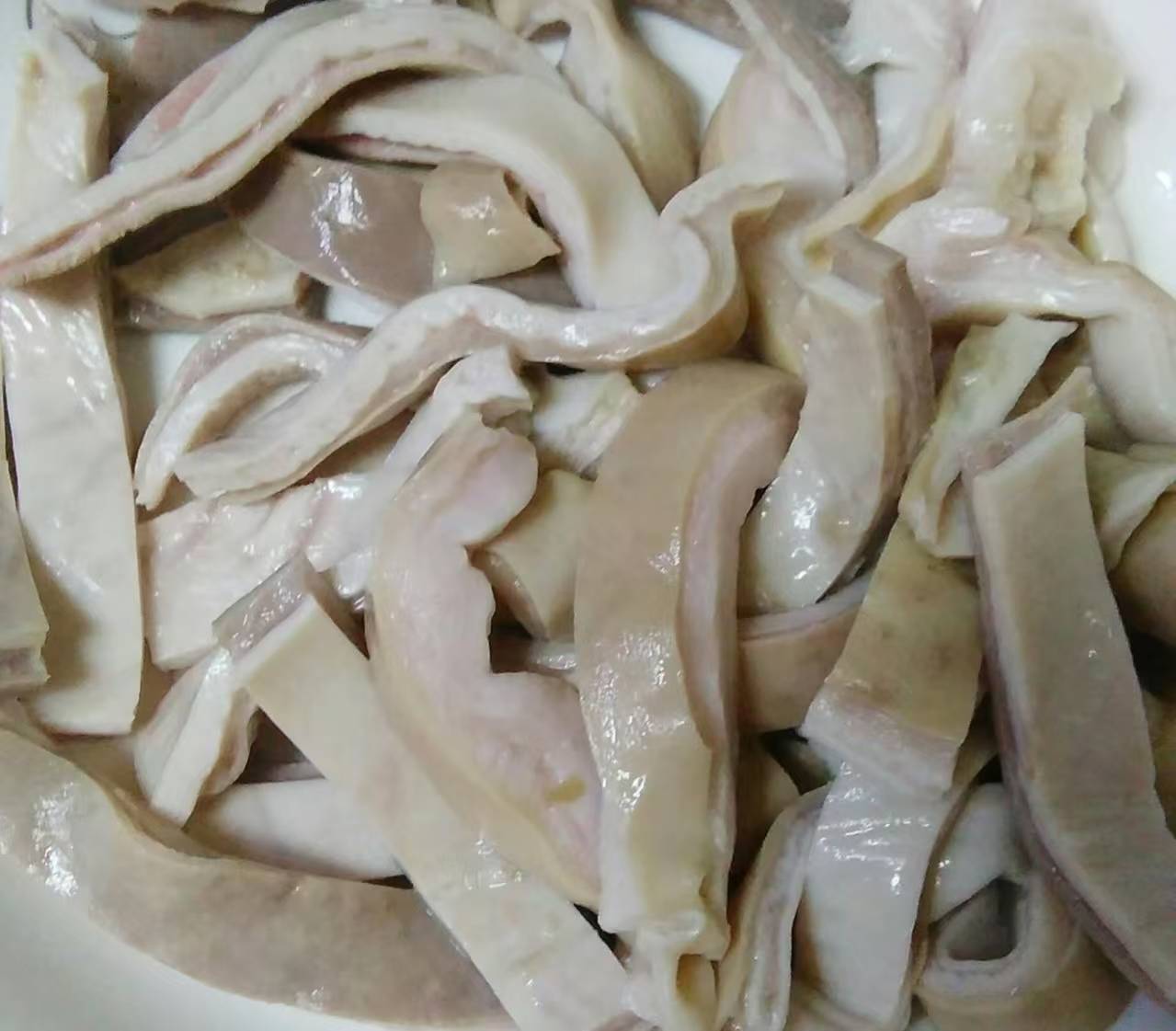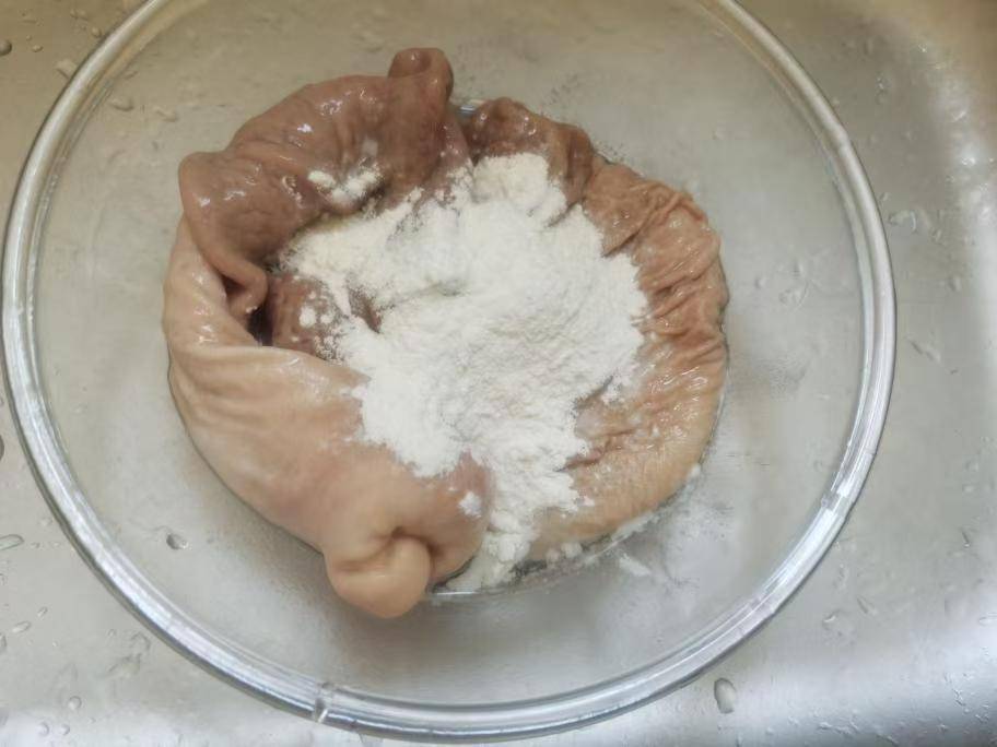 1、这个部位比较特殊,而且价格是比较高的,我们尽量现买现吃,不要经过冷冻保存再食用,以免浪费营养,也会影响口感。先放到清水下边,仔细冲冲,继而捞起来放在大碗里边。加上一些面粉,淋上白醋,混合到一起去仔细揉搓,每一处都需要搓到,不仅表面,内部也要翻过来去搓。其中有一些黏液要彻底搓掉,还有一些脂肪也不能保留,都要去掉。接着再把里外两面都冲到彻底干净,没有杂质为止。