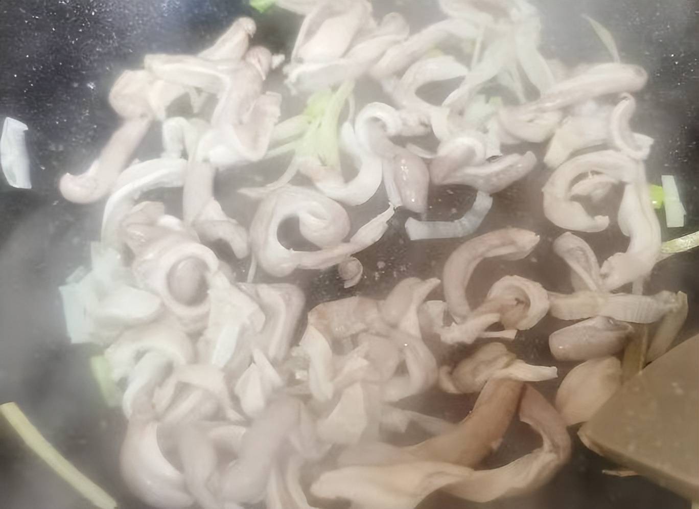 中小火慢炖,先煮透猪肚(约15分钟),再切条炒香;