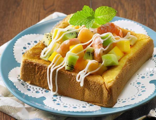 1. 虾仁烫熟,与水果丁用沙拉拌匀。