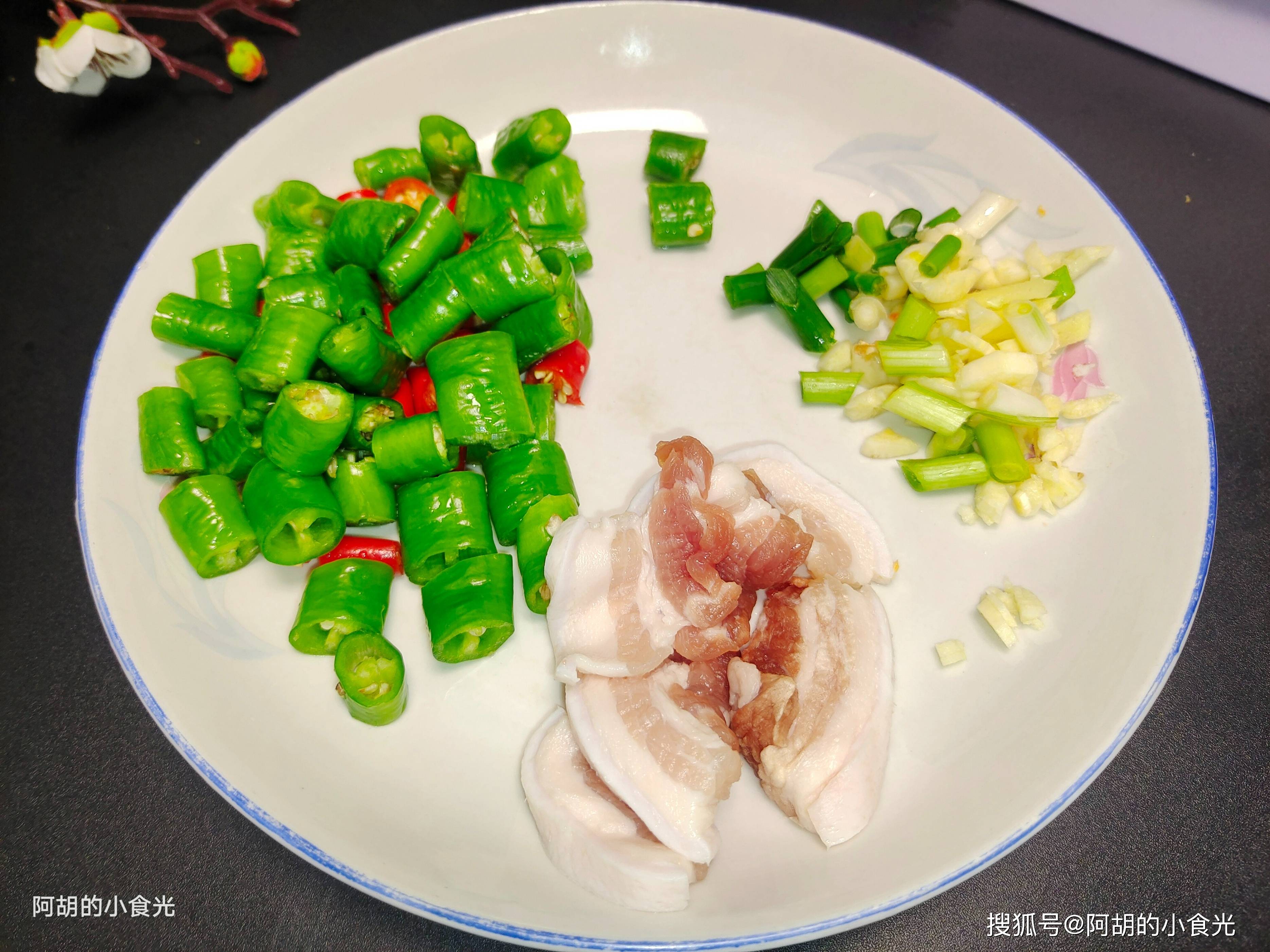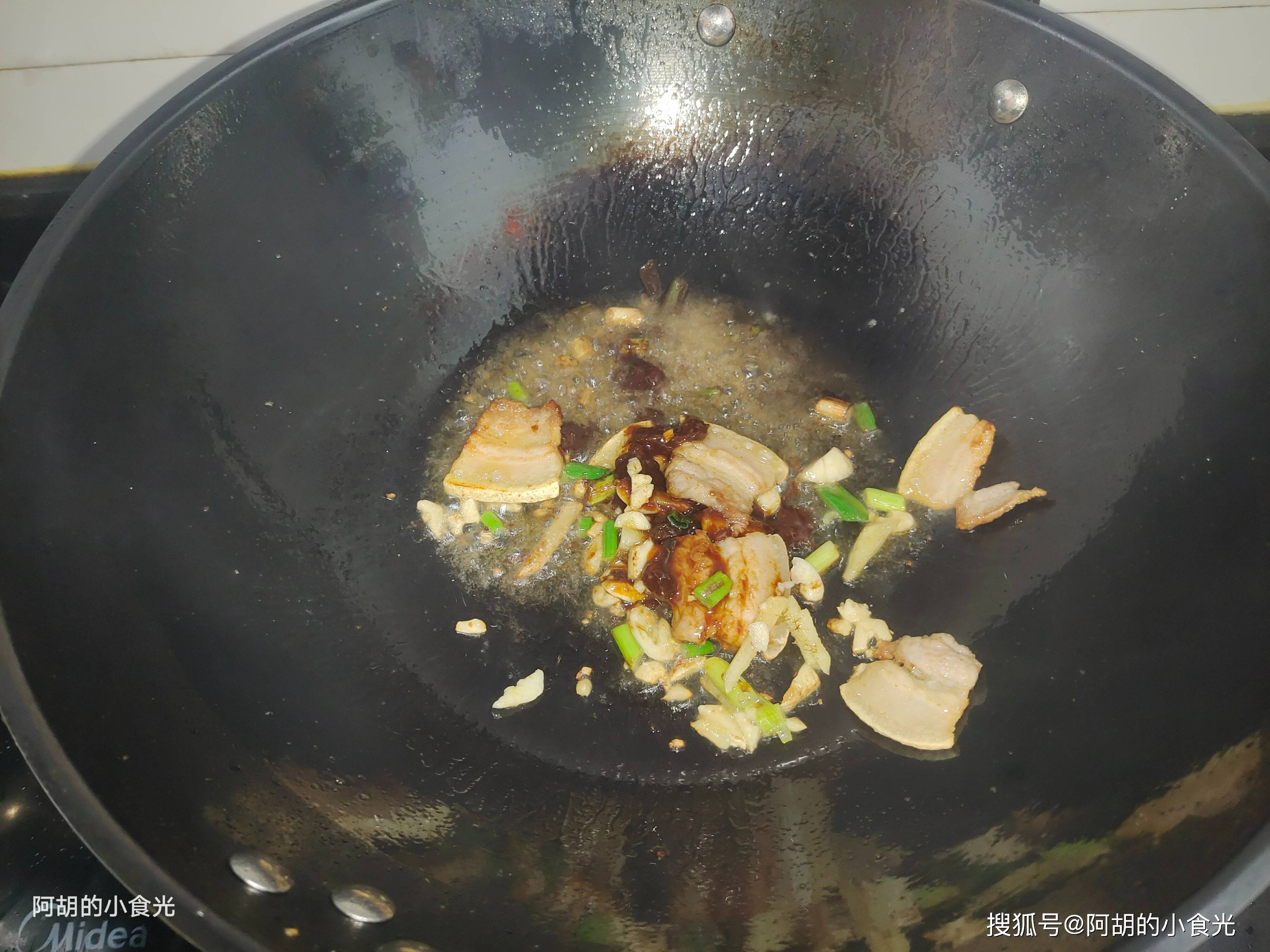 第三步:食材备好就可以开火烹饪了。先把里的水分烘干,淋入一些菜籽油小火烧热,把五花肉片先下锅煸炒出油脂和香味,再把葱姜蒜下锅炒出香味,此时可以再来两汤匙的黄豆酱下锅一块炒出香味。