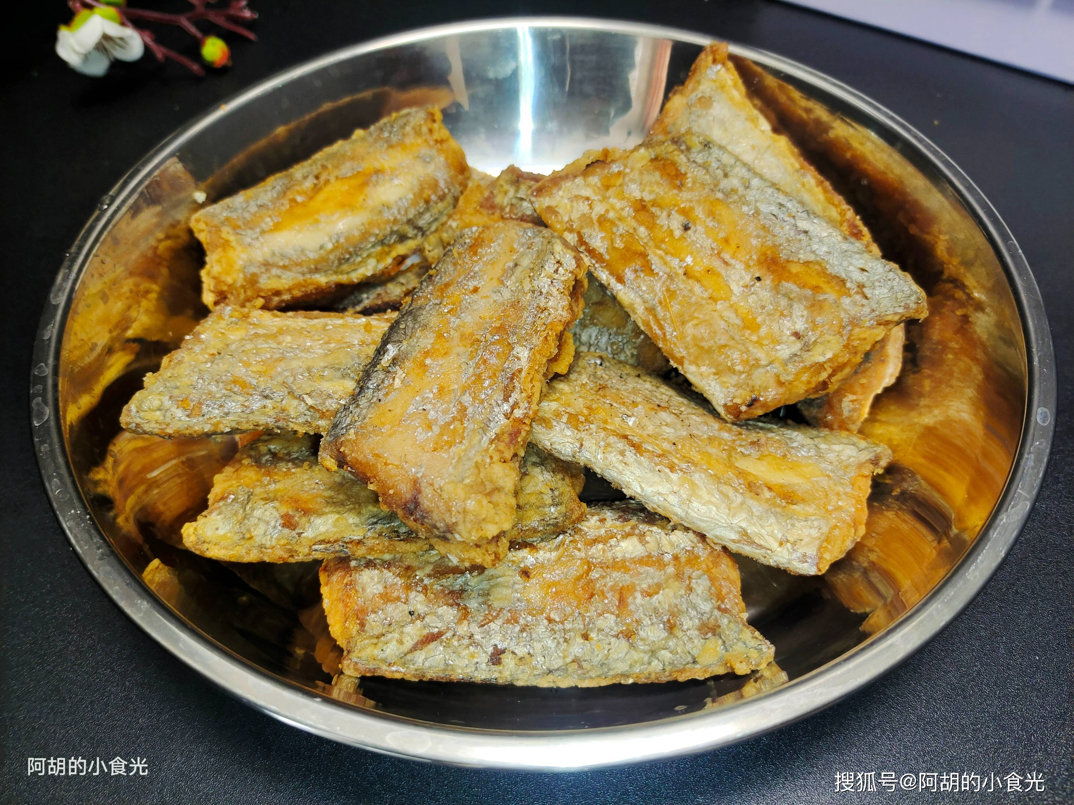 第一步:带鱼处理干净后斩段放入盆中,撒入少许食盐、料酒、葱姜等抓拌均匀腌制十几分钟。而后取出带鱼段蘸上一层淀粉下入油锅中炸至表面金黄就出锅待用。不想油炸的也可以采用少油煎的方式。