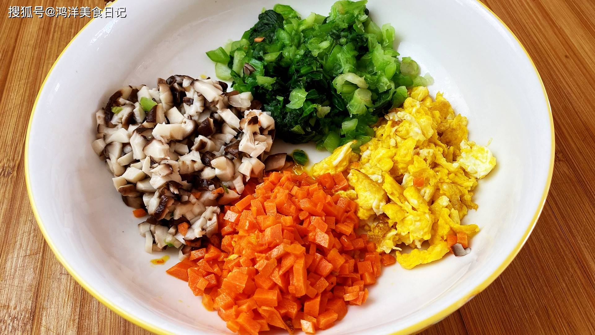 这里需要炒3个鸡蛋的鸡蛋碎,胡萝卜丁也要炒一下,这样既好吃又有营养,还有就是把油菜焯水,在切成小丁,不要剁的可碎可碎的了,那样不仅营养流失,口感也不好,香菇也要焯水,然后在切碎,记得攥一攥水分,不然容易酸酸的!