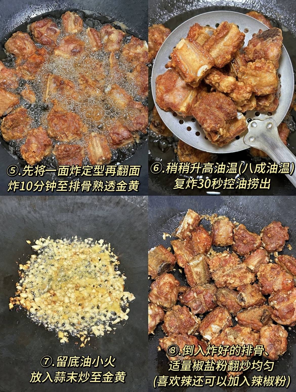 💡 操作注意:复炸需快准狠,避免蒜末炒焦;椒盐最后撒,防止返潮。