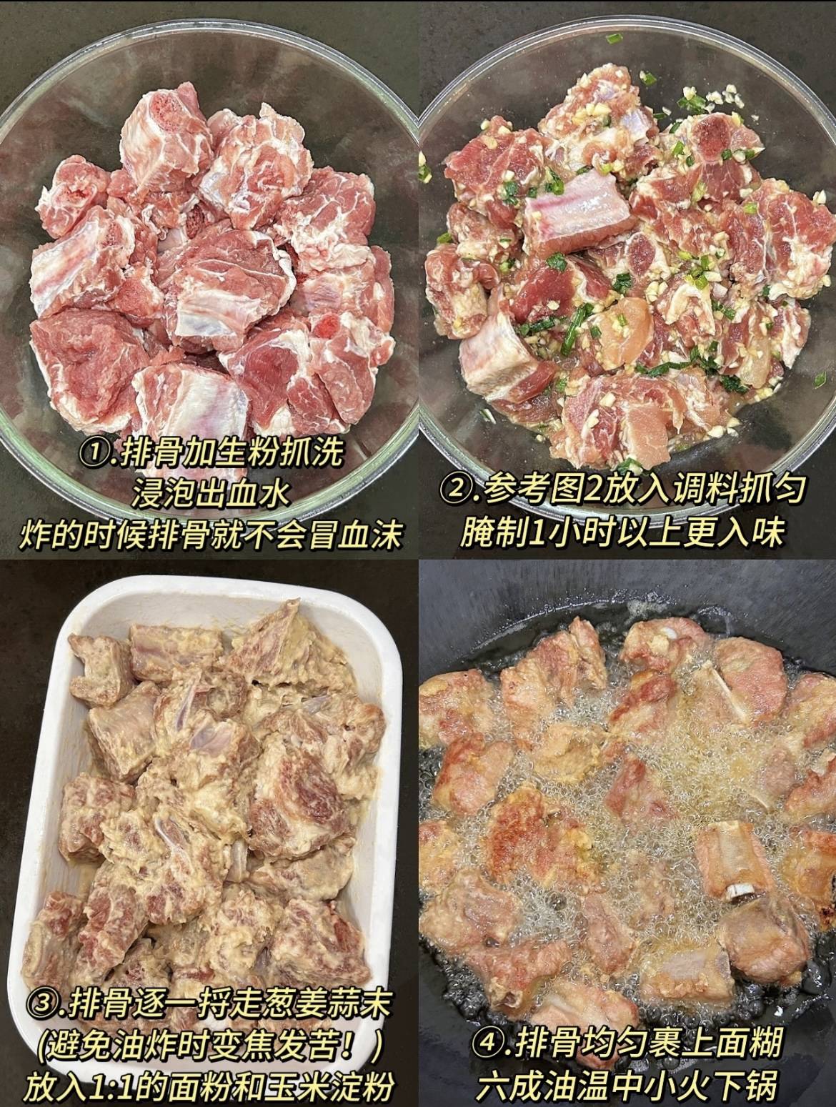 不足:可以增加一些在炸制过程中如何避免排骨粘连的小技巧,如一块块放入排骨、适时翻动等。