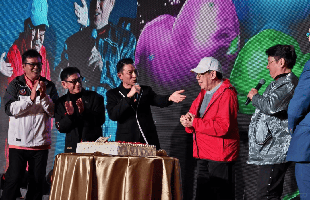 ▲ 黄日华与刘德华一左一右把胡枫搀上台,大家齐唱生日歌切蛋糕。