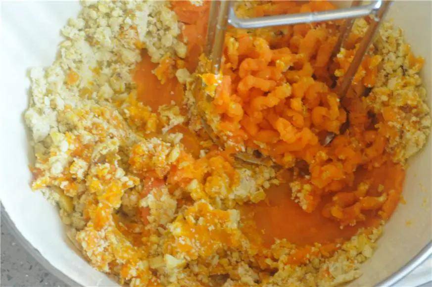 蒸好的南瓜趁热,倒入小米粉里,将南瓜捣成细腻的南瓜泥。