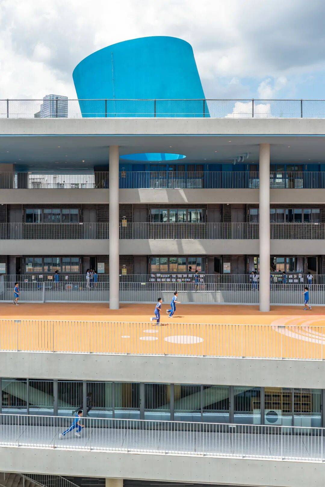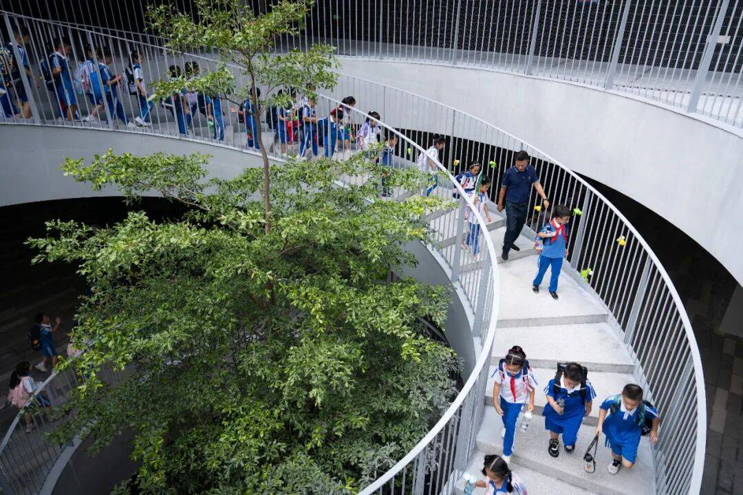 垂直平等:打破传统教学楼高层学生难以到达地面的局限,每层均设开放平台,确保不同楼层学生平等享受阳光、空气与活动空间。