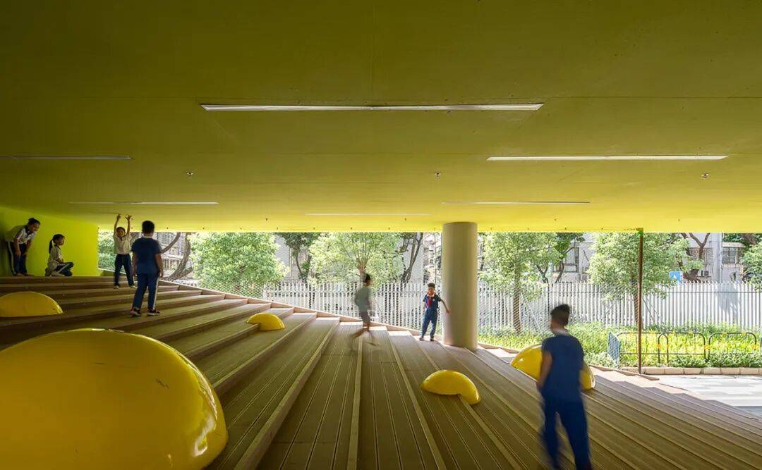 针对儿童行为特征,设计通过水平楼板交错形成多层活动平台,赋予“课间十分钟”新意义: