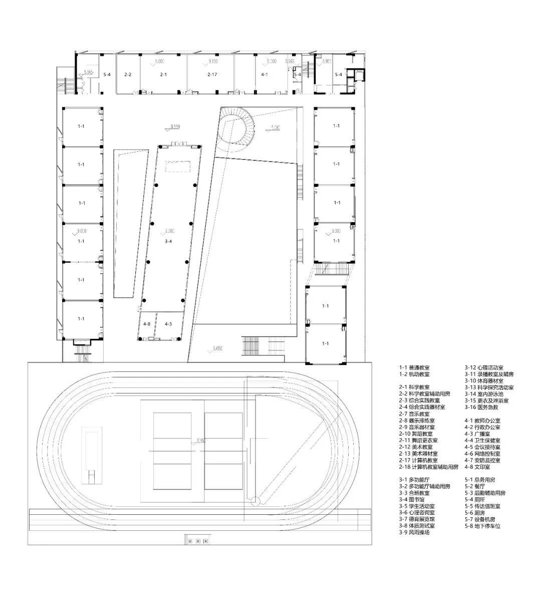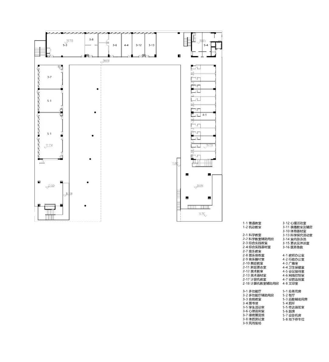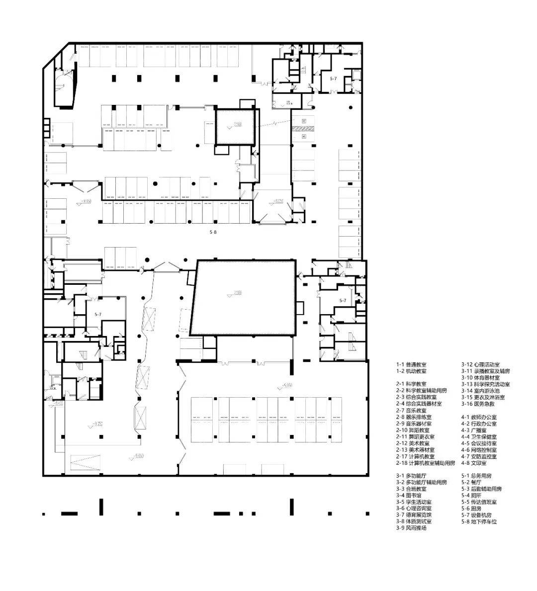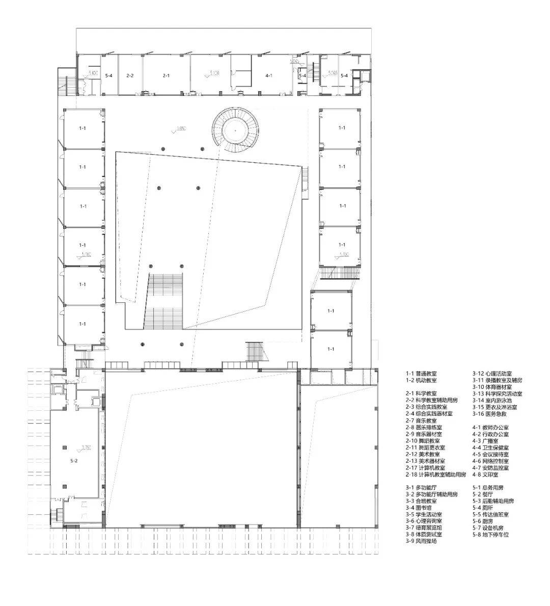 功能分区:普通教室单元沿周边布置,图书馆、报告厅、体育馆、游泳馆、艺术教室等共享功能围绕中央庭院展开,形成“学习中心”——借鉴美国开放式学校理念,打破封闭教室边界,使学习从室内延伸至整个校园,鼓励跨年级交流与偶然知识碰撞。
