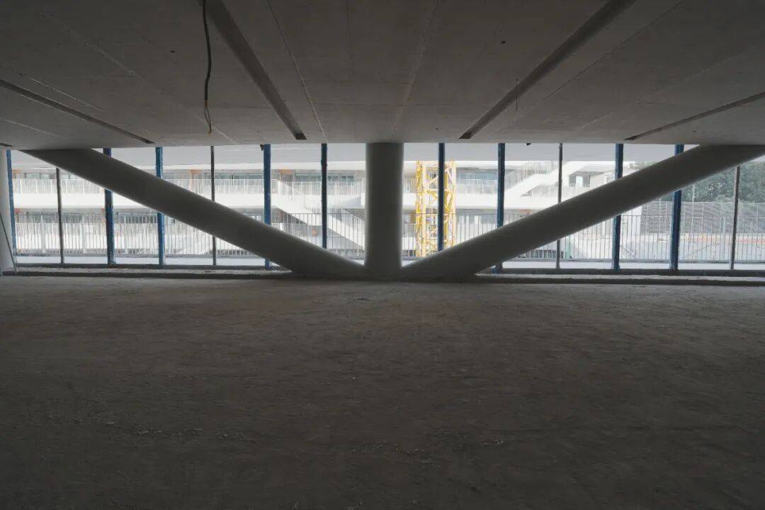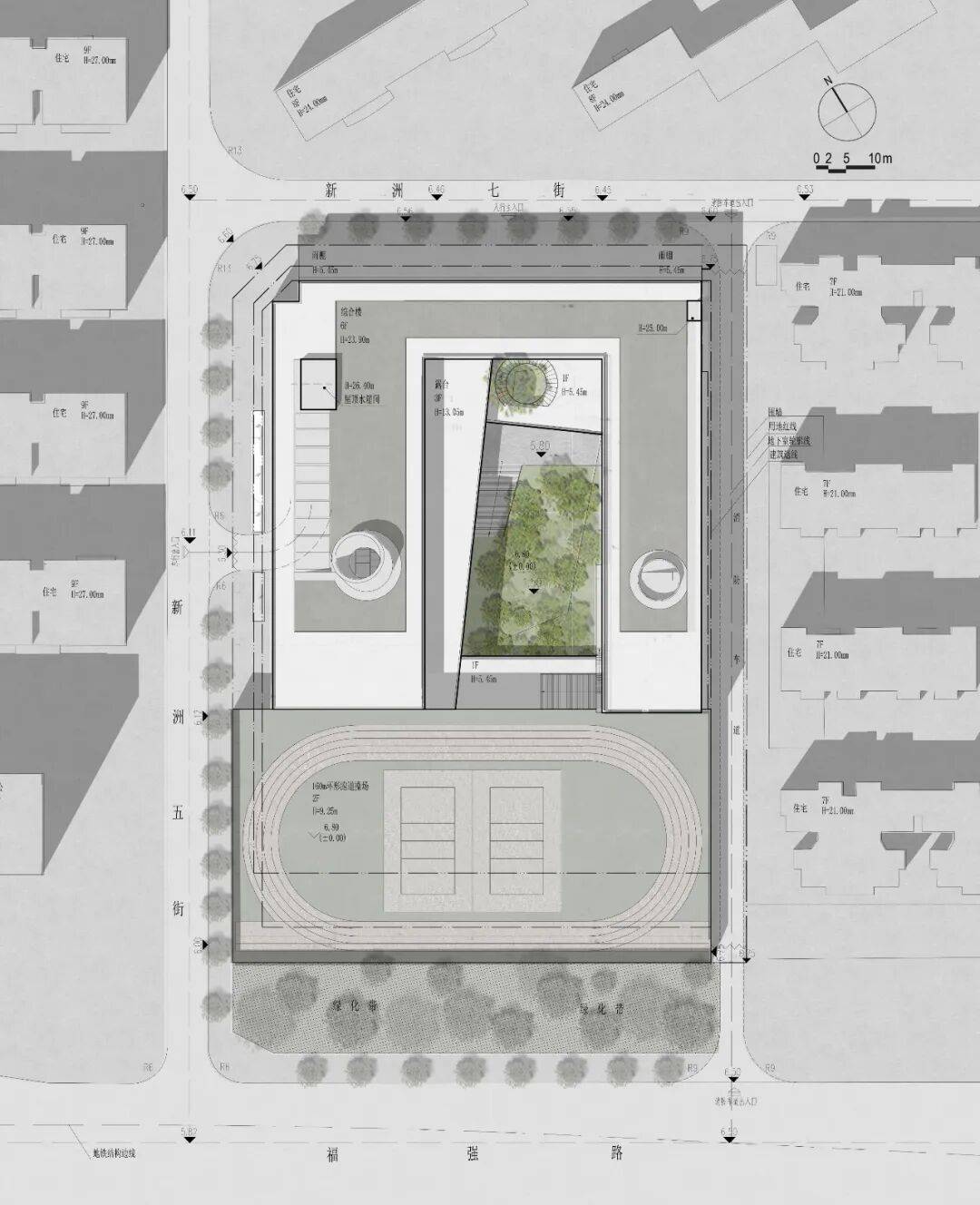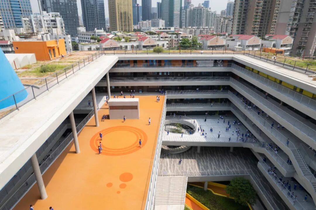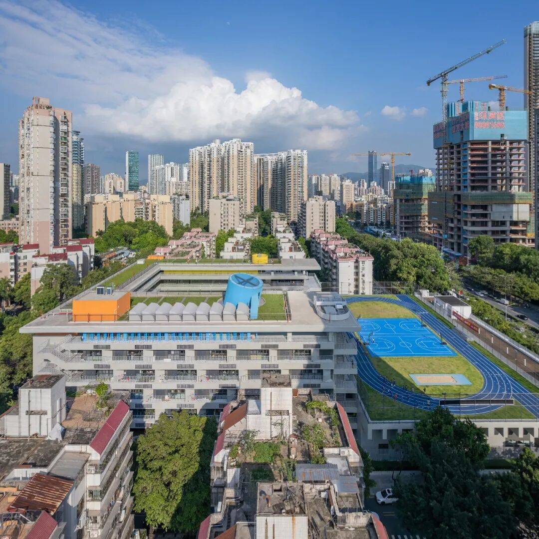 场地位于福田区新洲五街与七街交汇处,西南侧临城市主干道福强路(噪音较大),容积率2.26,是深圳高密度校园的典型代表。设计通过“上天下地”策略化解空间约束:垂直向利用屋顶、多层平台拓展活动空间,水平向通过错层布局形成丰富的立体院落,既规避了主干道噪音干扰,又在有限用地内实现了36班规模(原24班)的教学需求,总建筑面积达35985平方米。