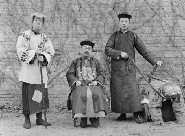 在许多照片中,我们看到的不仅仅是历史的影像,还有深刻的社会阶层差距。尤其在贫苦百姓的照片中,某些场景让我不禁想起一句话:艺术源于生活。记得在《智取威虎山》中,土匪老八为了让看门狗发挥作用,竟然把两个人绑在门口。起初,我以为这种情节只是编剧的虚构,但没想到,这竟是清朝时期发生过的真实事情。图中的看门狗实际上是个活生生的人,他穿着官员的衣服,极有可能还是四品以上的官员。对比之下,旁边被当做宠物狗的那个,显然是生活贫困的汉人。这样的场景,不仅让人震惊,也让我们深刻感受到那个时代的社会不公和封建残酷。