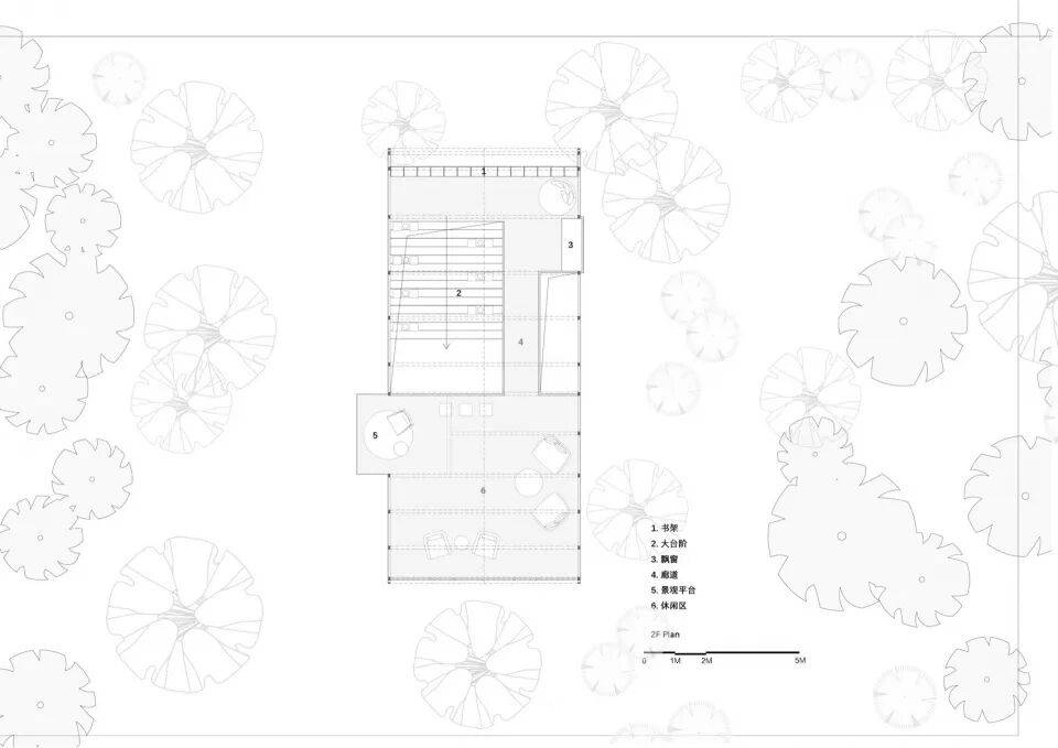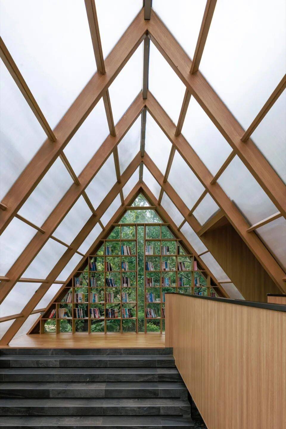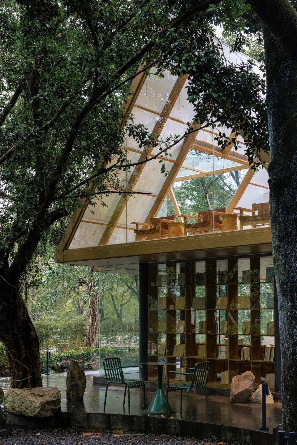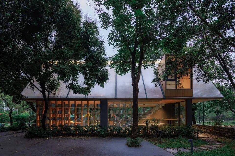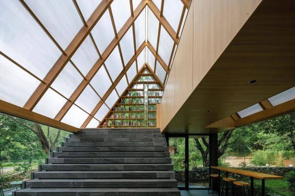 结构之舞:摒弃封闭箱体,采用轻盈的三角几何形态作为书屋顶盖结构。如同微微振动的蝶翼,这种锐利却不失柔和的形态,既提供了必要的遮蔽与空间感,又最大限度减少了体量感,令建筑如林间原生植物般,以优美的姿态“攀附”或“飘落”于溪畔树影之中。