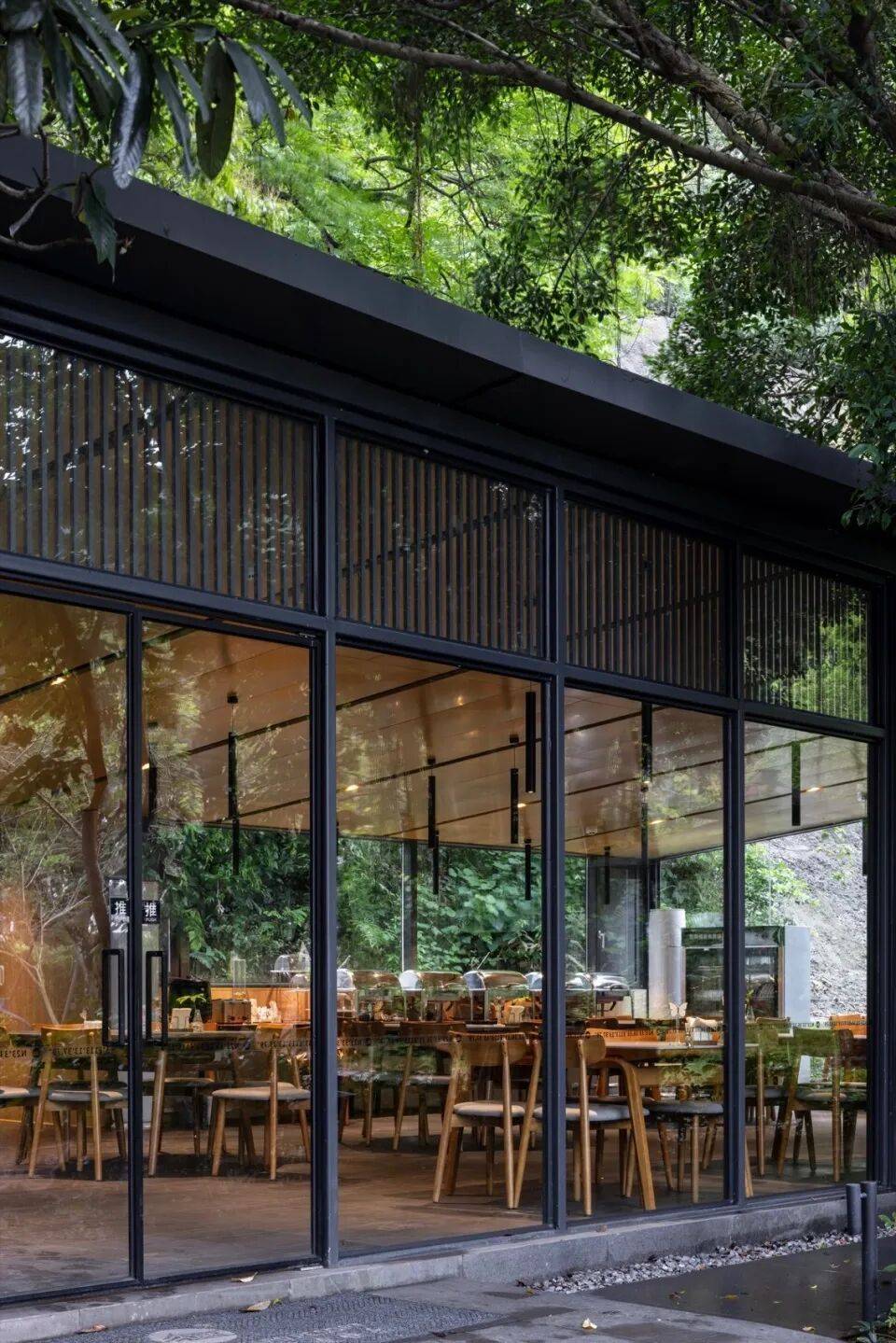 餐厅以黑色骨架与大面积落地玻璃弱化体量,化为林间的晶莹透明体: