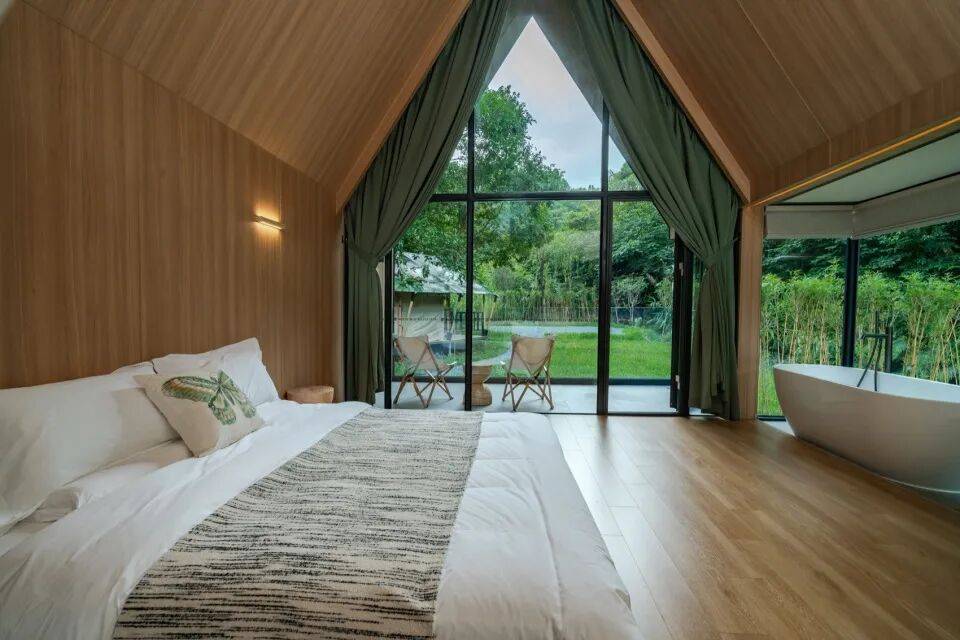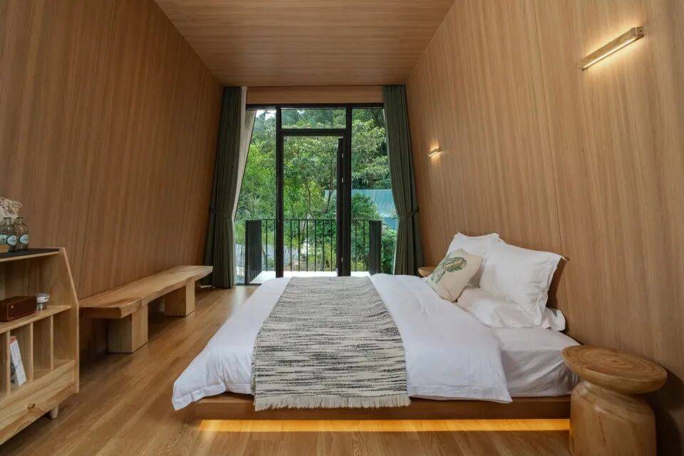 有机散落:客房的排布摒弃了僵硬的阵列,呈现出一种有机而有序的“散落”姿态。它们依据地形、植被间隙自然错落,彼此保持恰当的距离感,既保证了每栋客房的私密性与专属感,又让每扇窗外都是一幅由枝叶编织的、独一无二的森林画卷。这种布局模拟了森林自身的生长逻辑,秩序源于尊重。