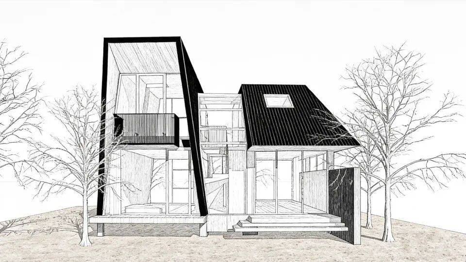 几何张力:直线与斜屋顶骨架形成秩序感,勾勒轻悬于林间的碳素速写;