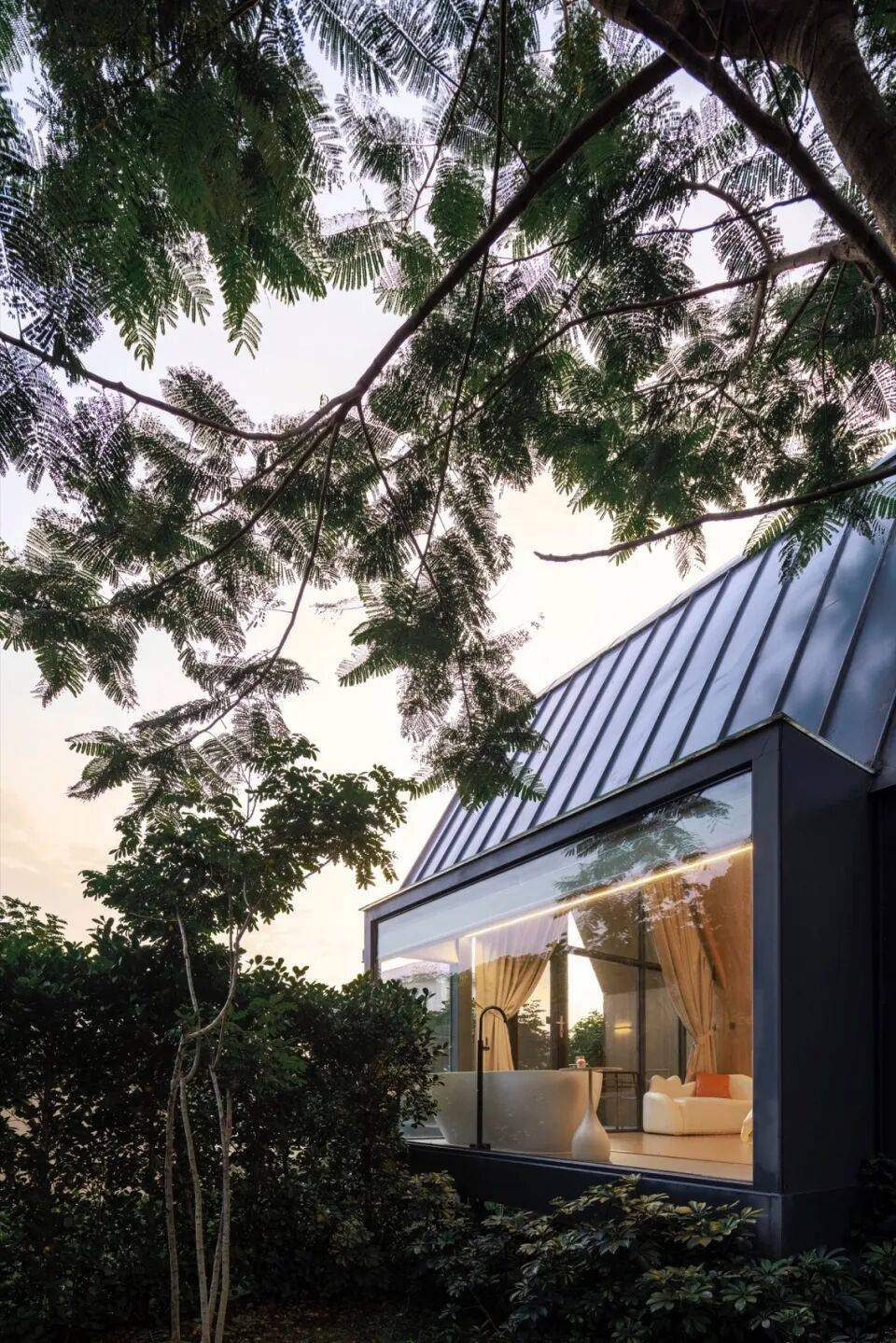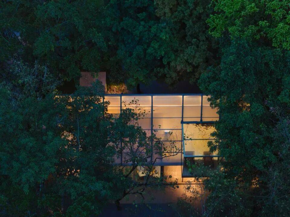体量弱化:透明玻璃消解建筑厚重感,使其如轻羽般悬浮于林间;