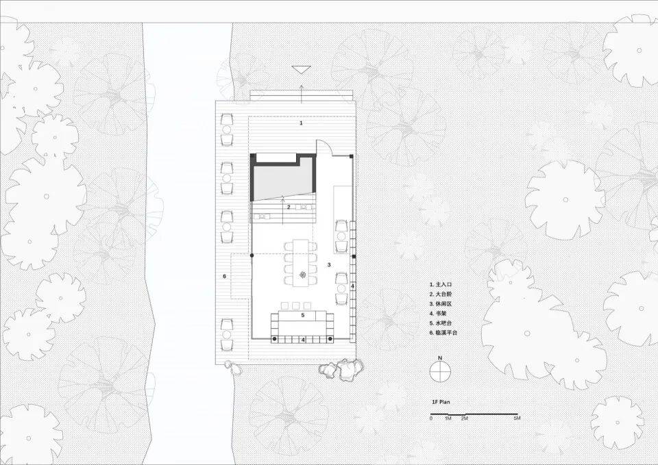溪岸观景:阅读区面向溪流,移除传统立面,视线、微风、溪声、树影自由穿透,形成沉浸式自然白噪音疗愈场;