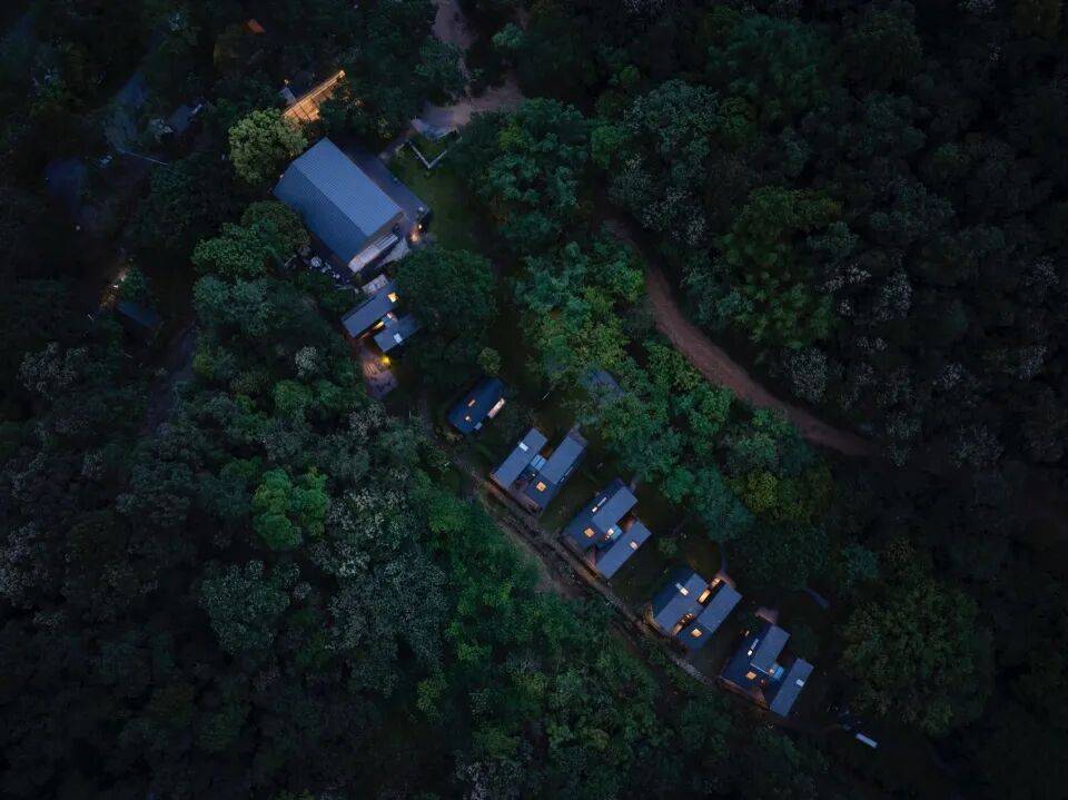 藏与显现:建筑深色调与森林浓绿色形成的视觉对话——深色的建筑轮廓在深浅不一的绿中若隐若现,如同林间自然生长的岩石,成为森林肌理的一部分。