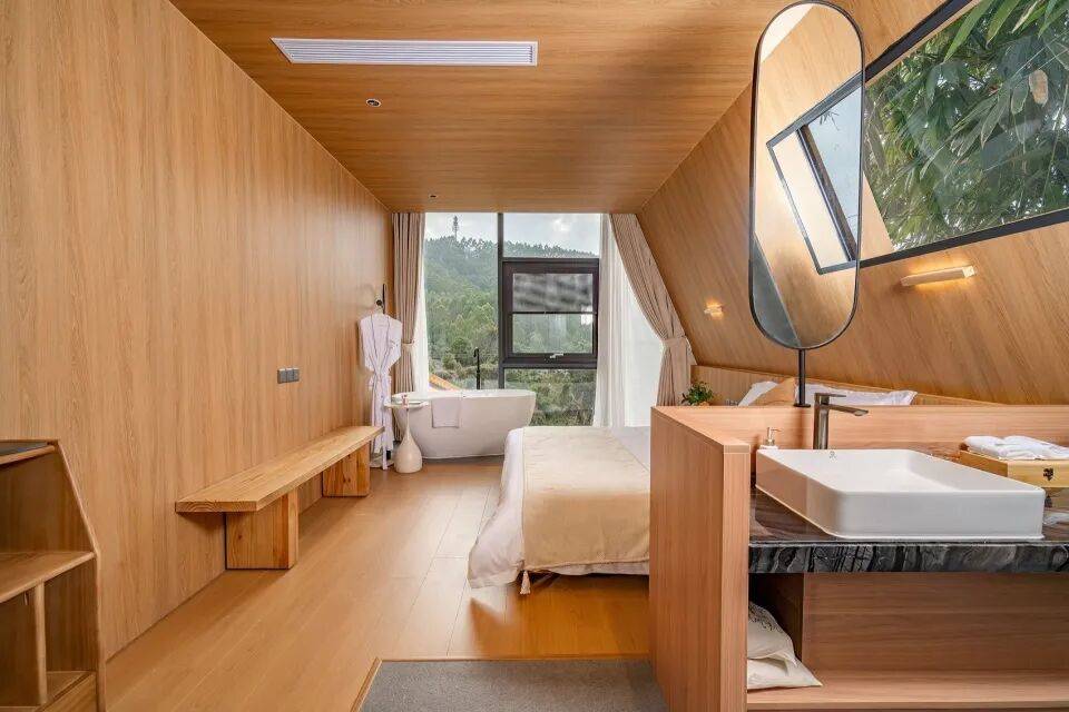 客房以“归巢”为概念,延续“野生叙事”的几何哲学: