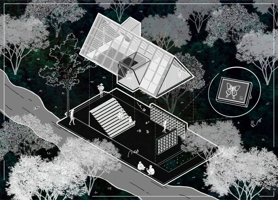 蝶之森林·蝶森书馆,旨在突破传统民宿配套功能,在广州花都王子山蝴蝶谷书写的一首凝固的山水诗篇。它以至轻的三角几何姿态、阳光板的朦胧界面和彻底开放的无界空间,谦卑地伏身于自然怀抱。在这里,建筑不再是一个固化的物体,而是一个呼吸的场域、一个捕捉光影的容器、一个引发蝶梦的引子。